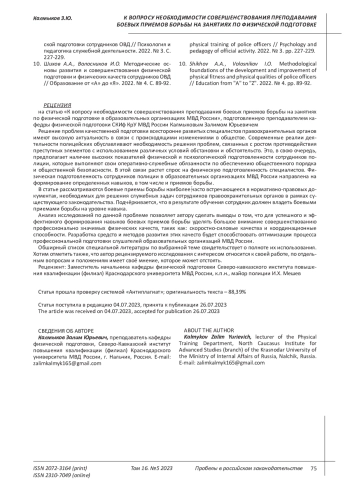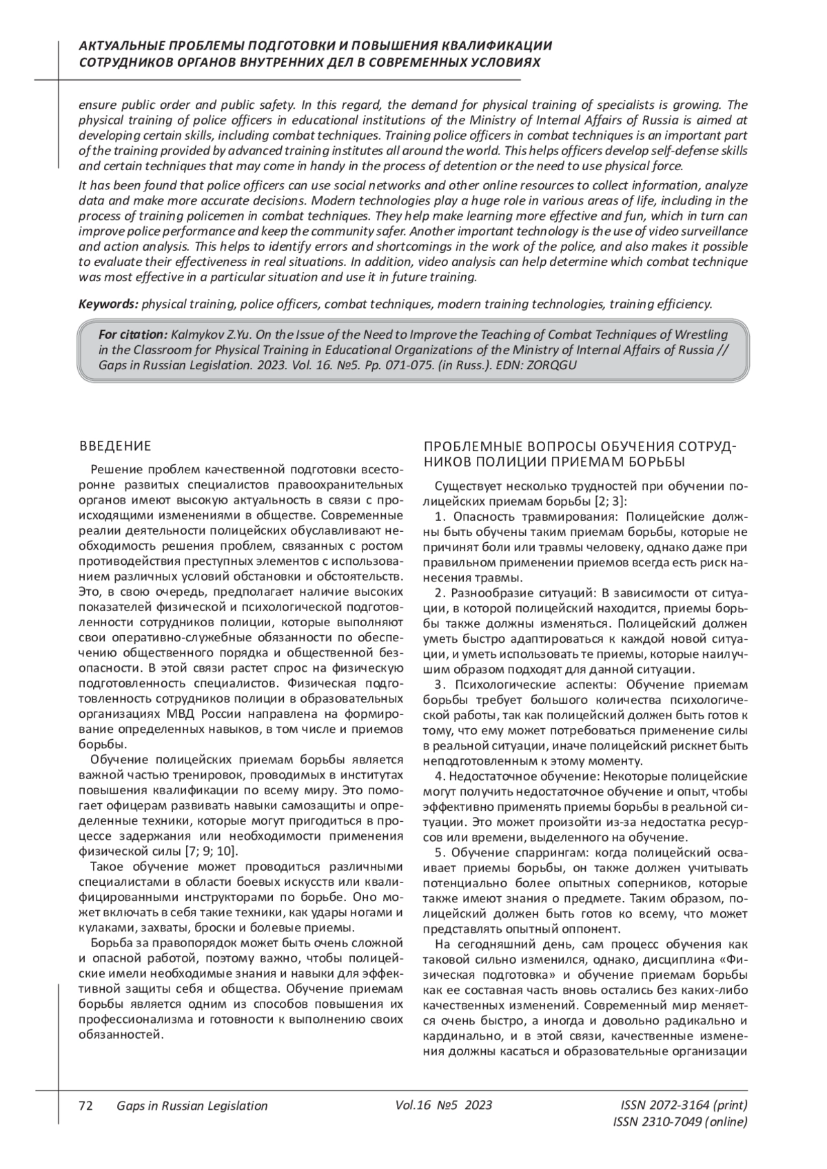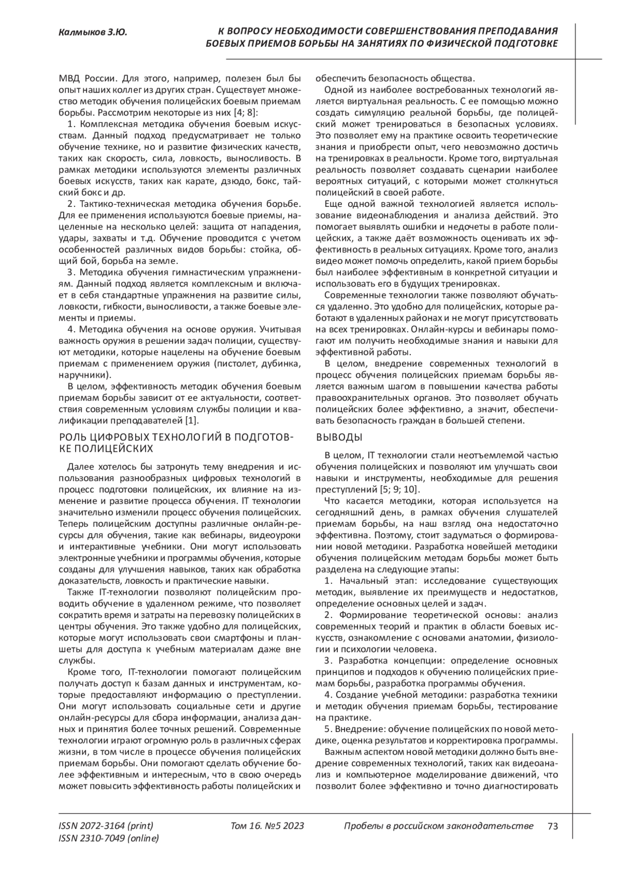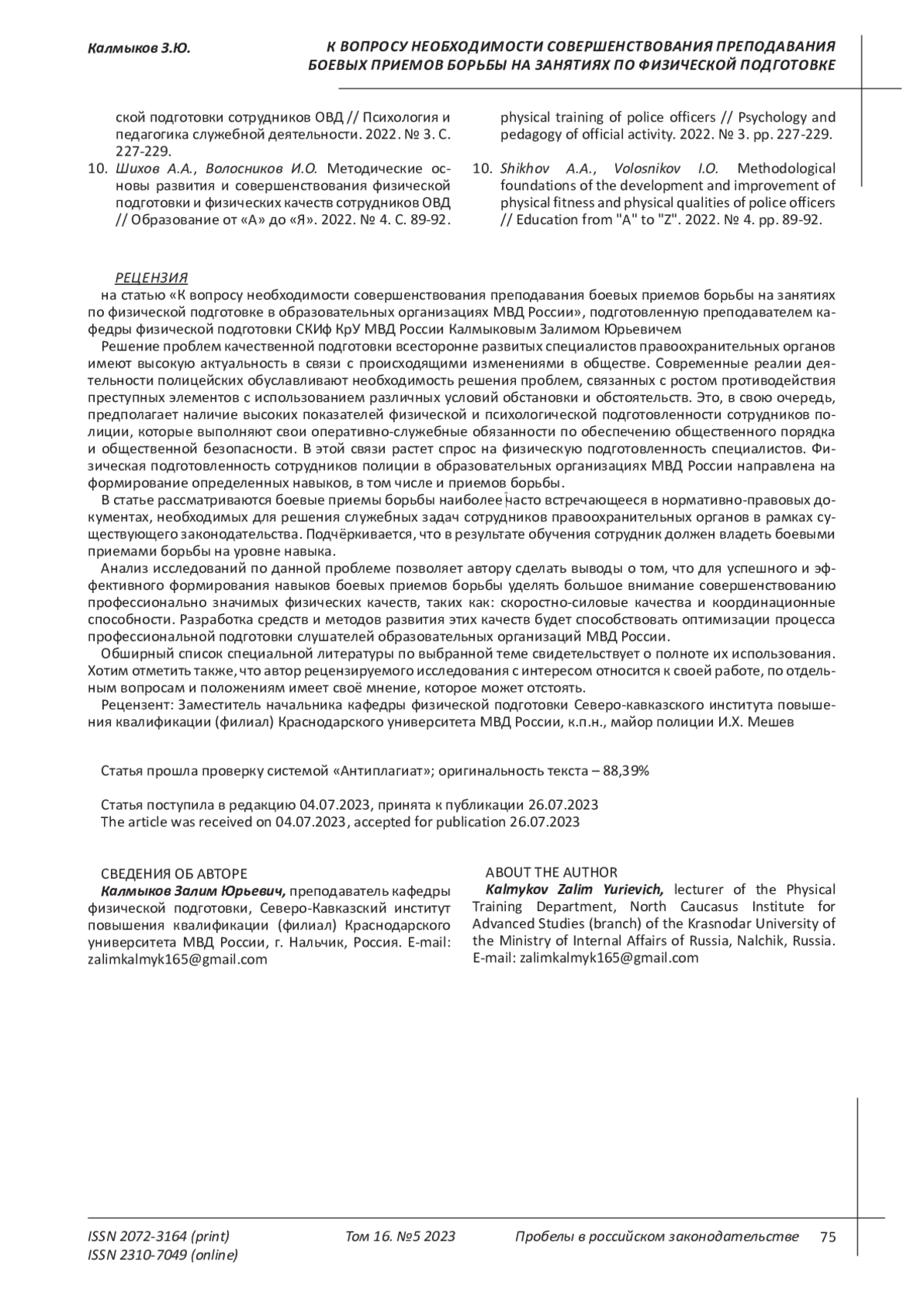 5. Мешев И.Х. О некоторых аспектах совершенствования подготовки сотрудников ОВД к боевым приемам борьбы в образовательных организациях мвд России // Образование. Наука. Научные кадры. 2020. № 1. С. 167-168. EDN: OJMAGU