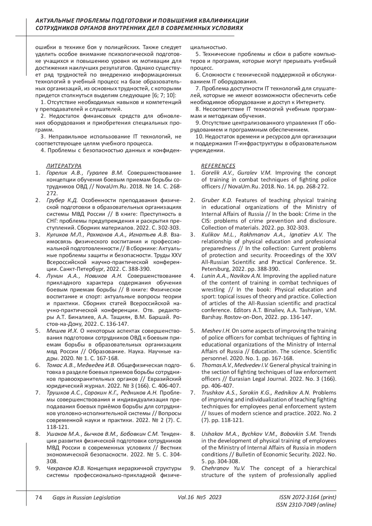 1. Горелик А.В., Гуралев В.М. Совершенствование концепции обучения боевым приемам борьбы сотрудников ОВД // NovaUm.Ru. 2018. № 14. С. 268-272. EDN: XYJQPJ