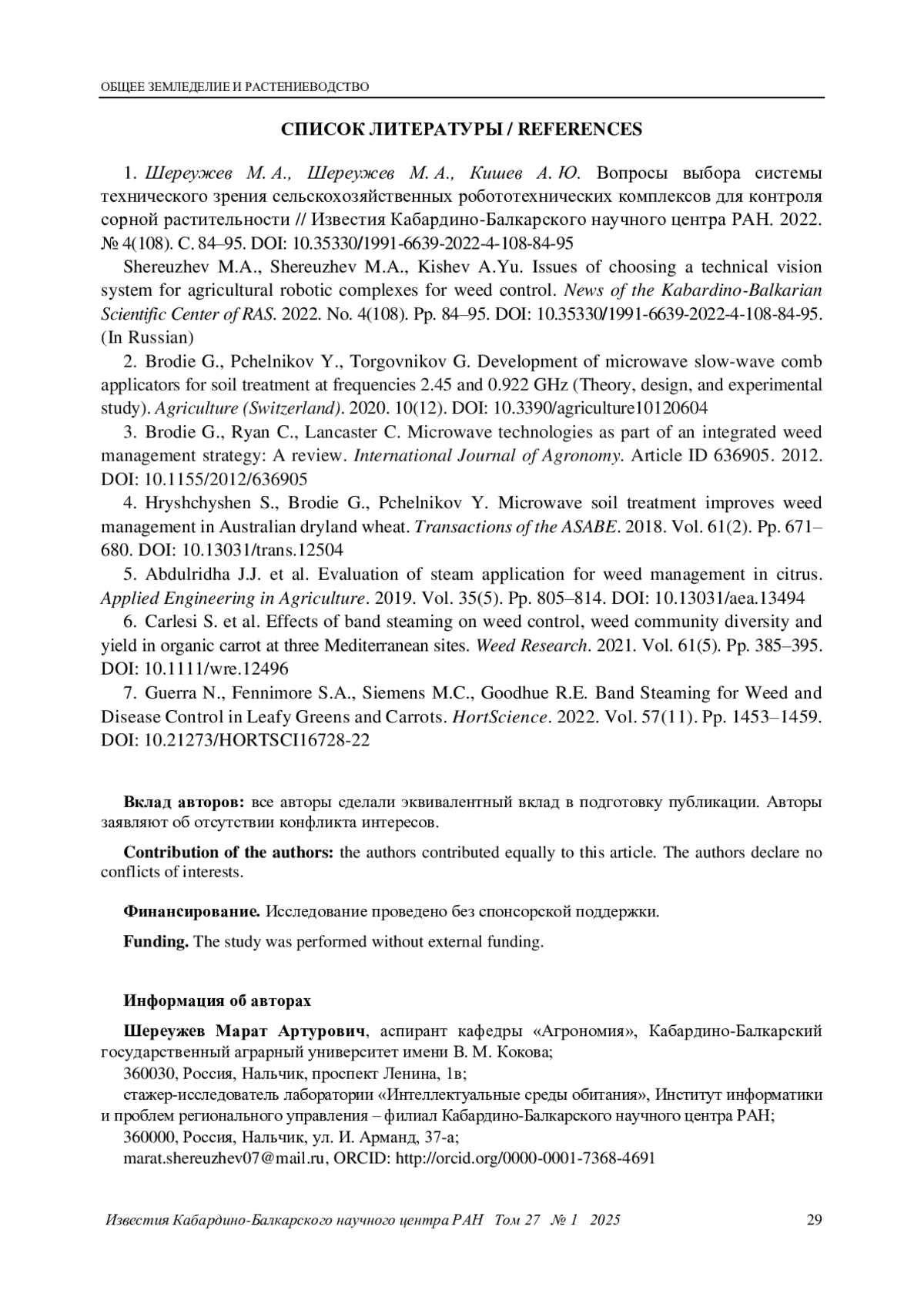 1. Шереужев М. А., Шереужев М. А., Кишев А. Ю. Вопросы выбора системы технического зрения сельскохозяйственных робототехнических комплексов для контроля сорной растительности // Известия Кабардино-Балкарского научного центра РАН. 2022. № 4(108). С. 84-95. DOI: 10.35330/1991-6639-2022-4-108-84-95 EDN: BRPTIB Shereuzhev M.A., Shereuzhev M.A., Kishev A.Yu. Issues of choosing a technical vision system for agricultural robotic complexes for weed control. News of the Kabardino-Balkarian Scientific Center of RAS. 2022. No. 4(108). Pp. 84-95. (In Russian). DOI: 10.35330/1991-6639-2022-4-108-84-95 EDN: BRPTIB