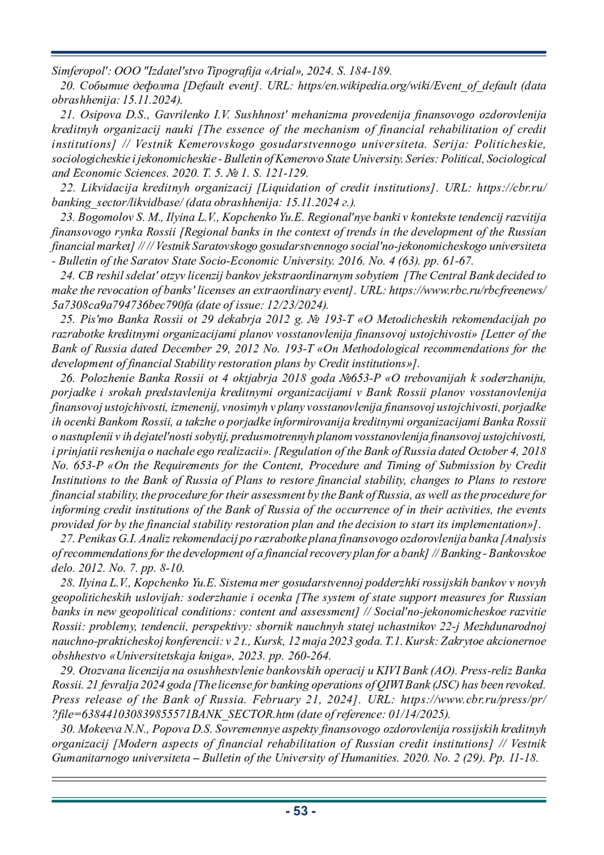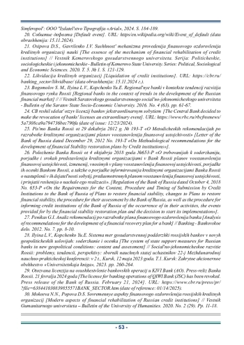 21. Осипова Д.С., Гавриленко И.В. Сущность механизма проведения финансового оздоровления кредитных организаций // Вестник Кемеровского государственного университета. Сер.: Политические, социологические и экономические науки. 2020. Т. 5. № 1. С. 121-129. EDN: YLMMIW