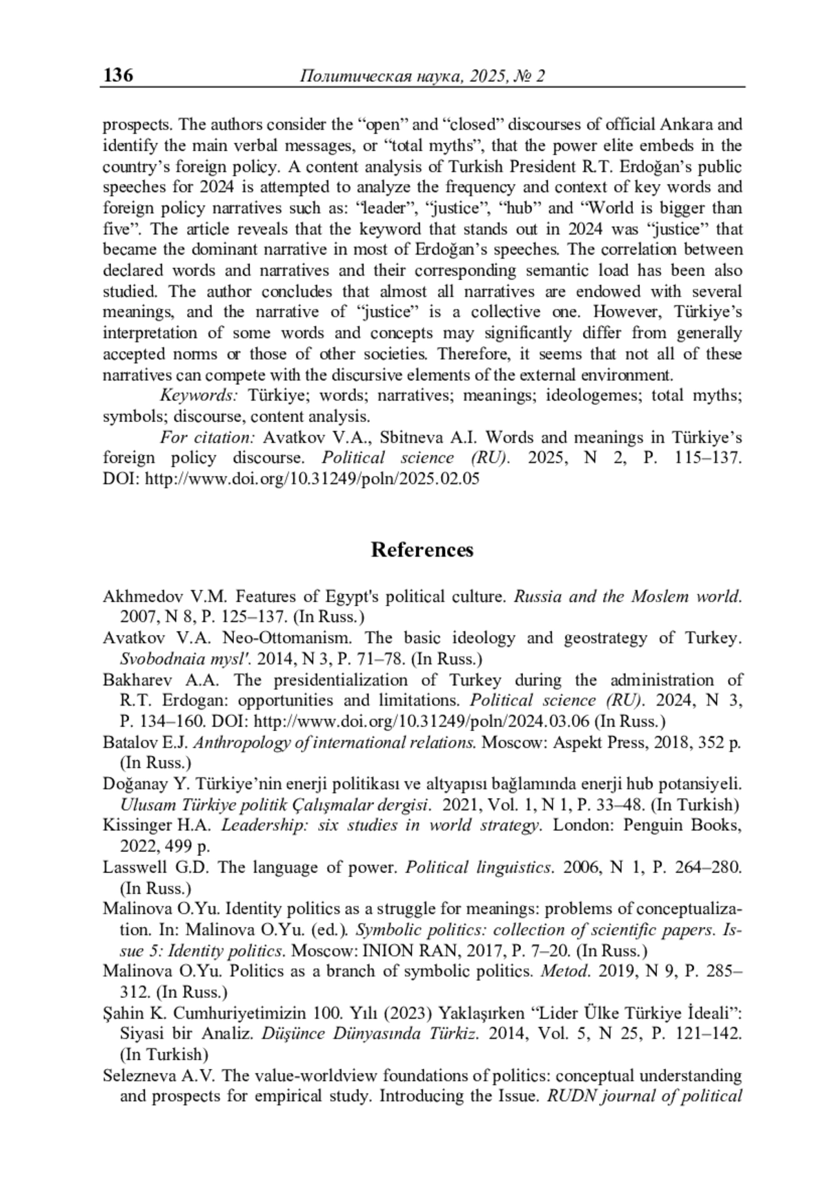 В статье рассмотрены слова и смыслы, составляющие основу внешнеполитического дискурса современной Турецкой Республики, значение которой на международной арене повышается из года в год. Дискурс является неотъемлемой частью политики любого государства и вместе с тем важным маркером настроений, преобладающих в обществе. Принимая во внимание разворот России на Восток и многоплановое партнерство с Турцией, задача по изучению ее внешнеполитических нарративов обретает особую актуальность с точки зрения стратегического планирования и перспектив двусторонних отношений. Авторы рассматривают «открытые» и «закрытые» нарративы официальной Анкары, а также выделяют главные вербальные посылы или «тотальные мифы», которые встраиваются властной элитой во внешнеполитический курс государства. Предпринята попытка с помощью контент-анализа публичных выступлений президента Турции Р. Т. Эрдогана за 2024 г. проанализировать частоту и контекст употребления ключевых слов, таких как: «лидер», «справедливость», «хаб» и «Мир больше пяти». Определено, что ключевым в 2024 г. стал нарратив о «справедливости», которому была посвящена бо́льшая часть речей турецкого лидера. Наряду с этим изучено соотношение декларируемого с реальным. Выявлено, что почти каждое слово наделяется как минимум несколькими смыслами, а нарратив о справедливости и вовсе является собирательным. Однако трактовка ряда слов и концептов президентом Турции может существенным образом отличаться от общепринятых норм или трактовок другими обществами. В связи с этим не все из них представляются конкурентоспособными относительно дискурсивных элементов внешней среды.