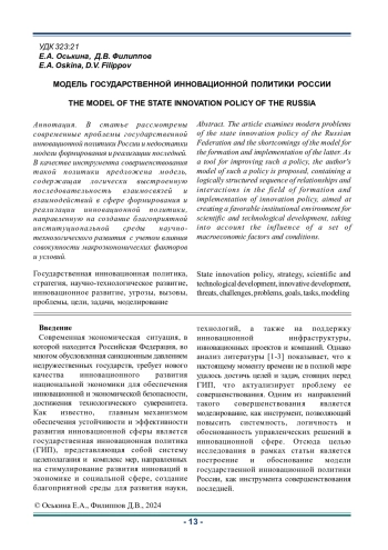 В статье рассмотрены современные проблемы государственной инновационной политики России и недостатки модели формирования и реализации последней. В качестве инструмента совершенствования такой политики предложена модель, содержащая логически выстроенную последовательность взаимосвязей и взаимодействий в сфере формирования и реализации инновационной политики, направленную на создание благоприятной институциональной среды научно- технологического развития с учетом влияния совокупности макроэкономических факторов и условий.