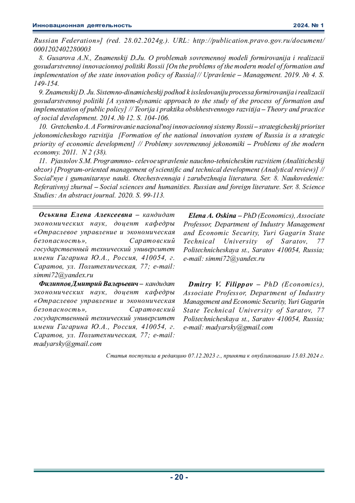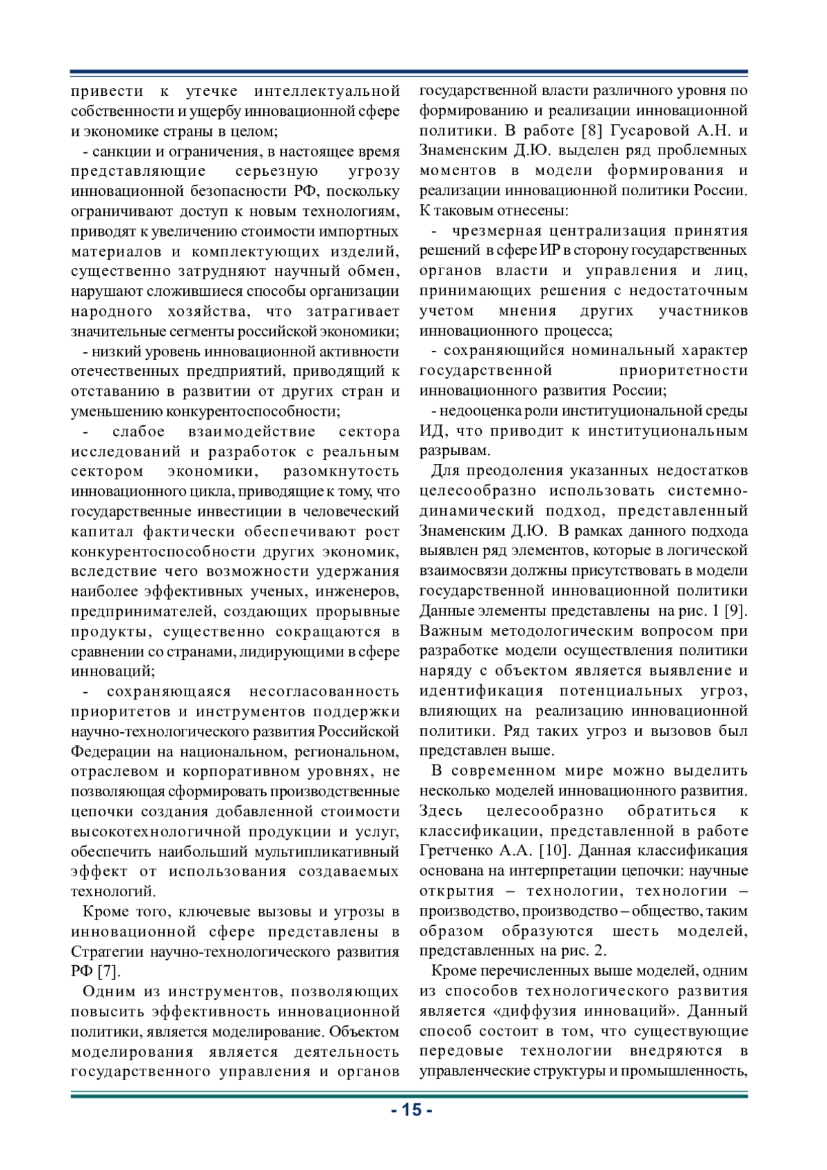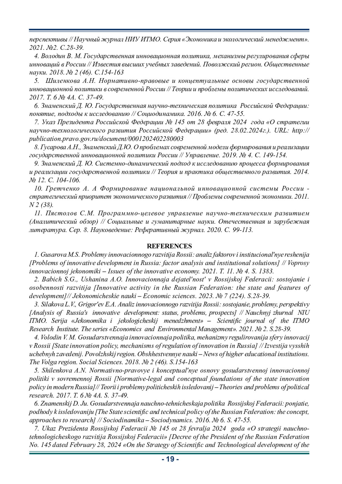 8. Гусарова А.Н., Знаменский Д.Ю. О проблемах современной модели формирования и реализации государственной инновационной политики России // Управление. 2019. № 4. С. 149-154. EDN: HGFCPX