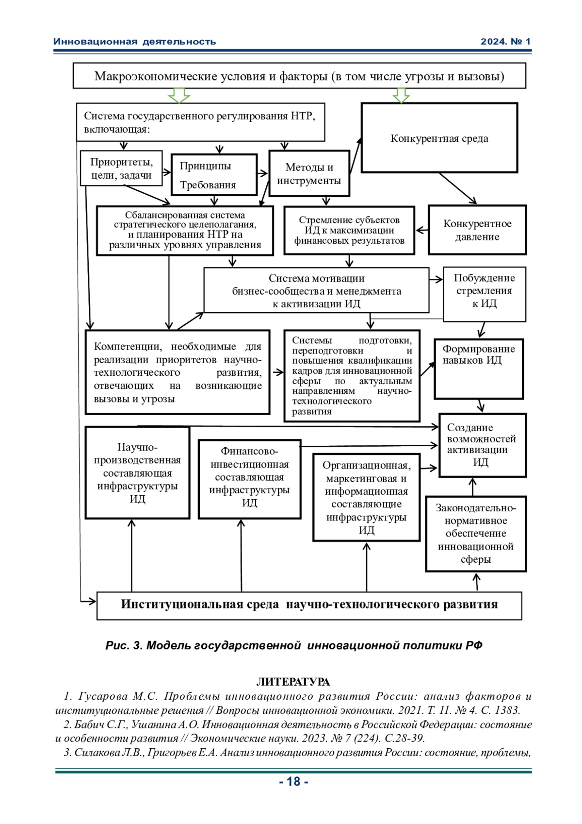 1. Гусарова М.С. Проблемы инновационного развития России: анализ факторов и институциональные решения // Вопросы инновационной экономики. 2021. Т. 11. № 4. С. 1383. EDN: AFUPPT