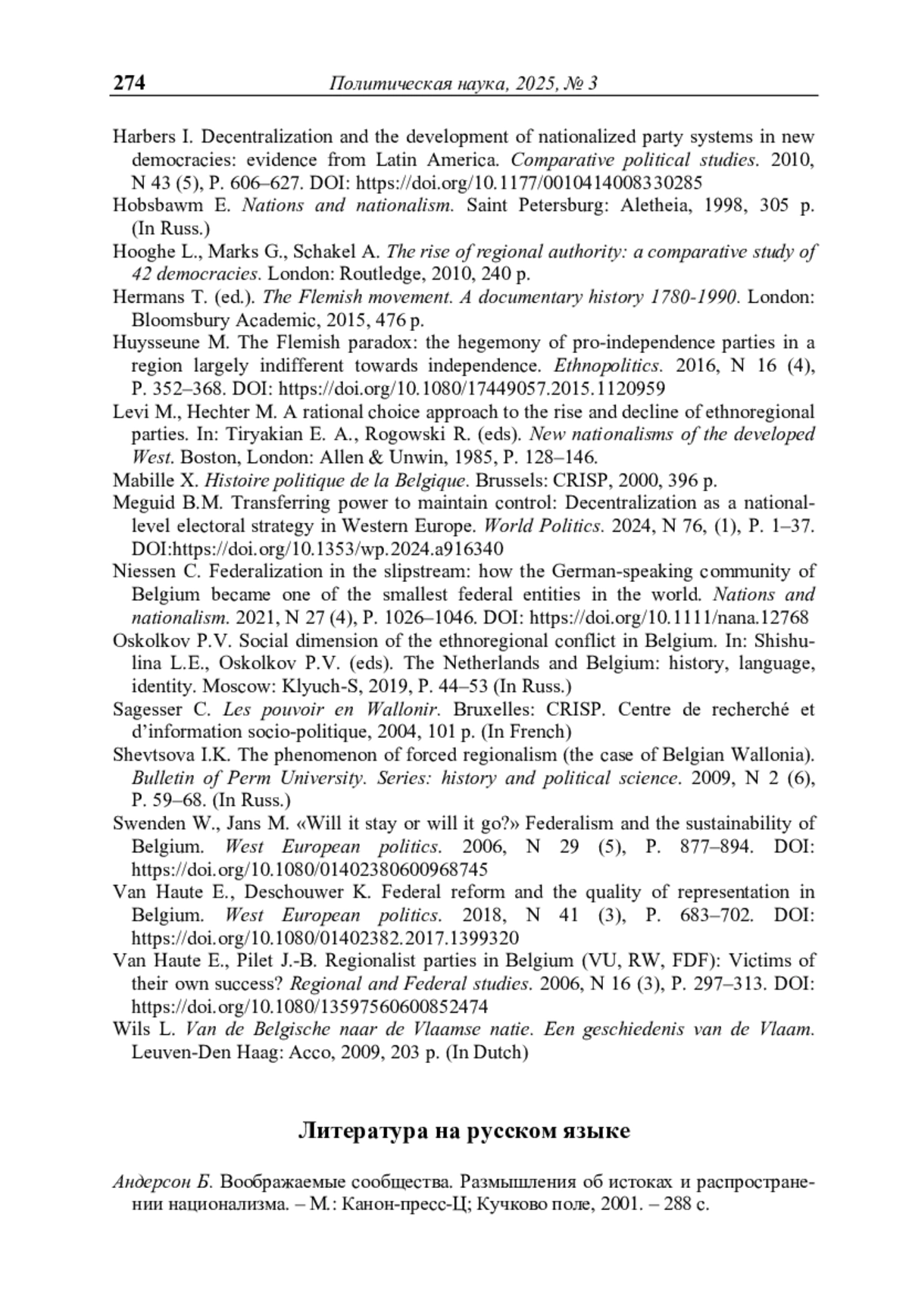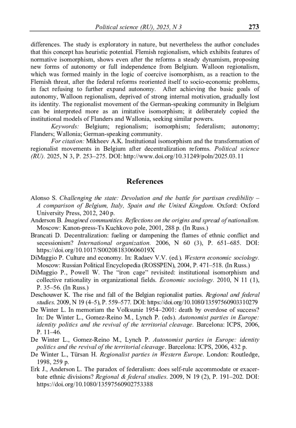 МИХЕЕВ А. К. ИНСТИТУЦИОНАЛЬНЫЙ ИЗОМОРФИЗМ И ТРАНСФОРМАЦИЯ РЕГИОНАЛИСТСКИХ ДВИЖЕНИЙ В БЕЛЬГИИ ПОСЛЕ РЕФОРМ ДЕЦЕНТРАЛИЗАЦИИ // ПОЛИТИЧЕСКАЯ НАУКА. 2025. №3