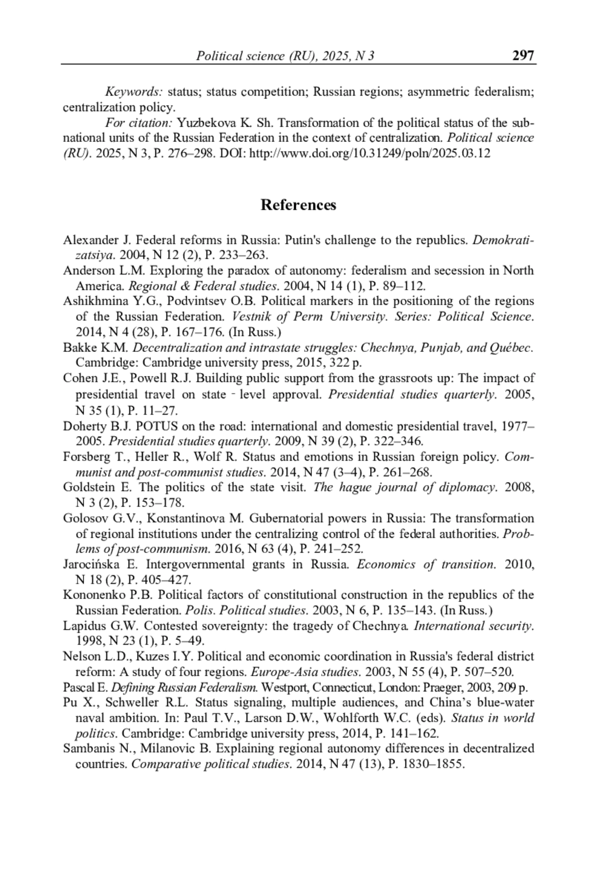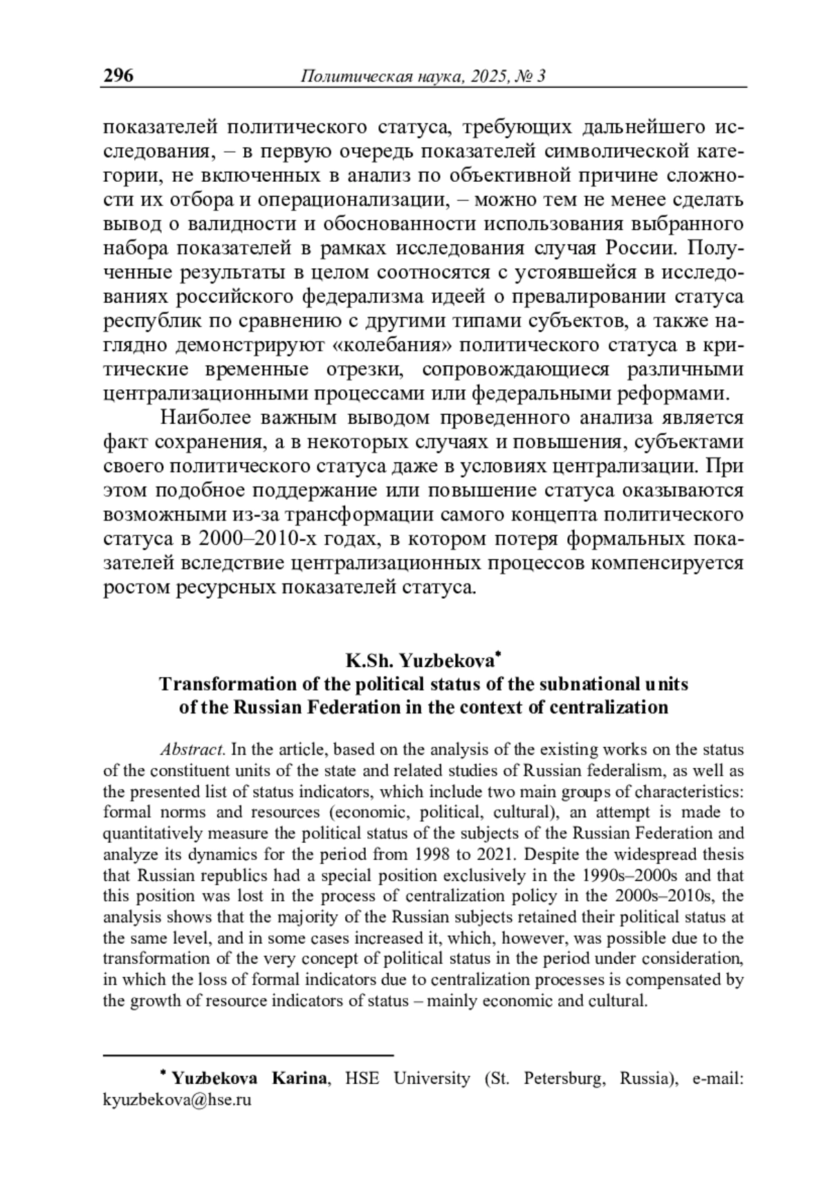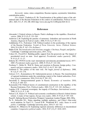 ЮЗБЕКОВА К. Ш. ТРАНСФОРМАЦИЯ ПОЛИТИЧЕСКОГО СТАТУСА СУБЪЕКТОВ РОССИЙСКОЙ ФЕДЕРАЦИИ В УСЛОВИЯХ ЦЕНТРАЛИЗАЦИИ // ПОЛИТИЧЕСКАЯ НАУКА. 2025. №3