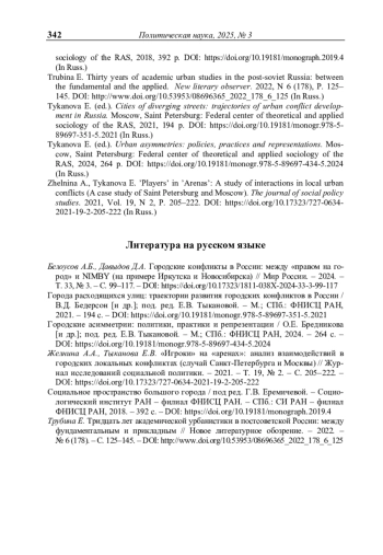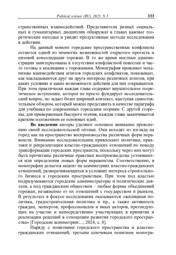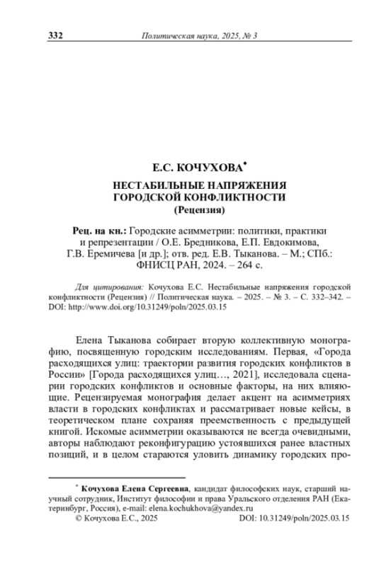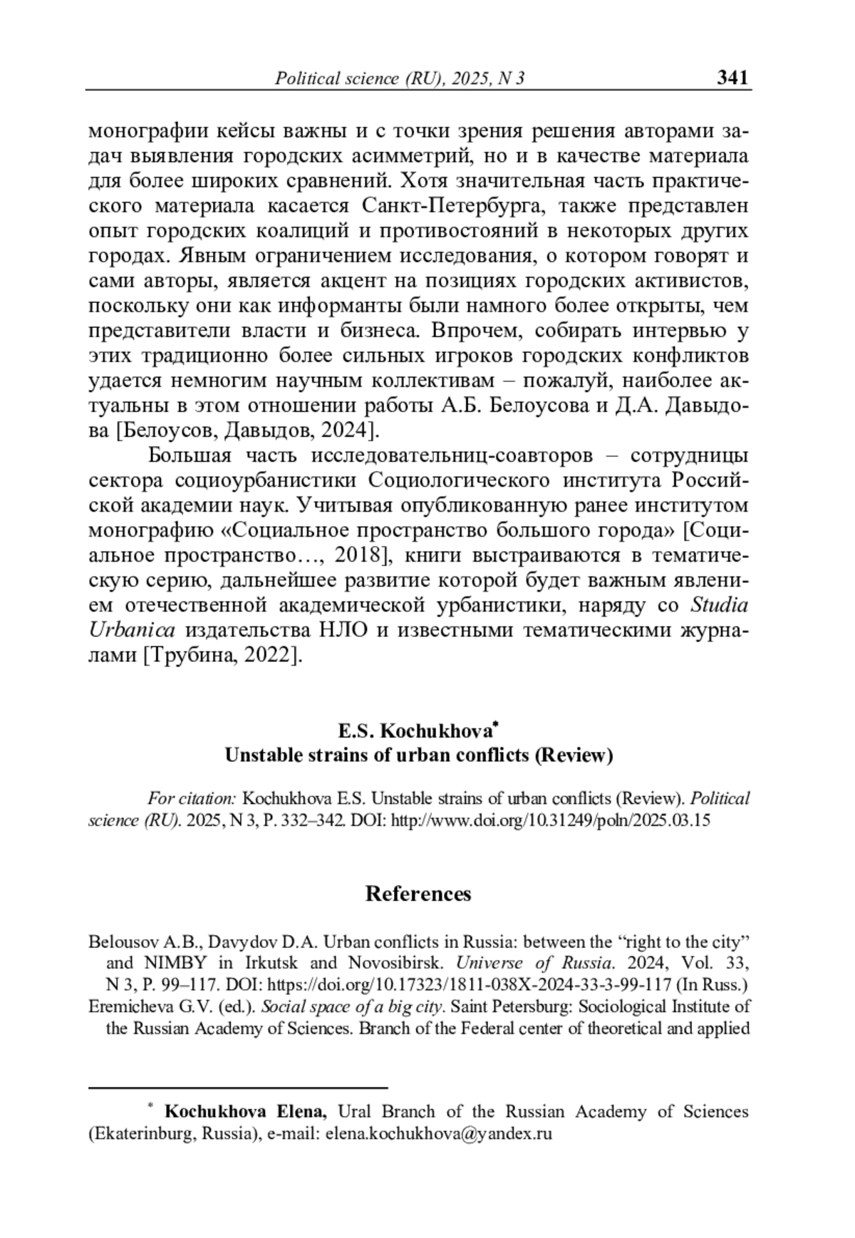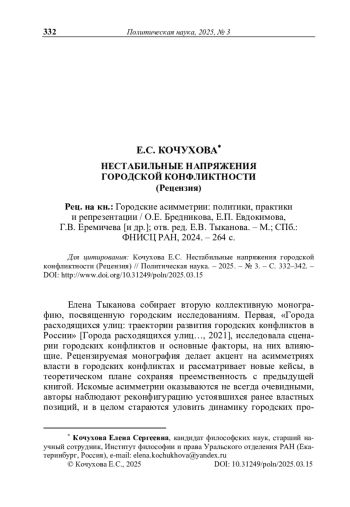 КОЧУХОВА Е. С. НЕСТАБИЛЬНЫЕ НАПРЯЖЕНИЯ ГОРОДСКОЙ КОНФЛИКТНОСТИ (РЕЦЕНЗИЯ) // ПОЛИТИЧЕСКАЯ НАУКА. 2025. №3