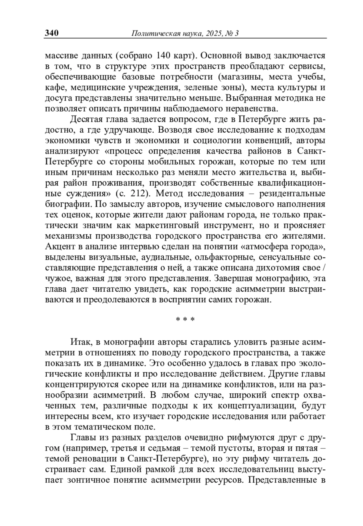 Рец. на кн.: Городские асимметрии: политики, практики и репрезентации / О. Е. Бредникова, Е. П. Евдокимова, Г. В. Еремичева [и др.]; отв. ред. Е. В. Тыканова. – М.; СПб.: ФНИСЦ РАН, 2024. – 264 с.