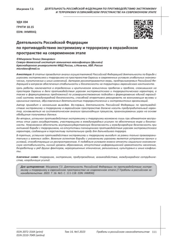 МИСРОКОВ Т. З. ДЕЯТЕЛЬНОСТЬ РОССИЙСКОЙ ФЕДЕРАЦИИ ПО ПРОТИВОДЕЙСТВИЮ ЭКСТРЕМИЗМУ И ТЕРРОРИЗМУ В ЕВРАЗИЙСКОМ ПРОСТРАНСТВЕ НА СОВРЕМЕННОМ ЭТАПЕ // ПРОБЕЛЫ В РОССИЙСКОМ ЗАКОНОДАТЕЛЬСТВЕ. 2023. Т. 16 № 5