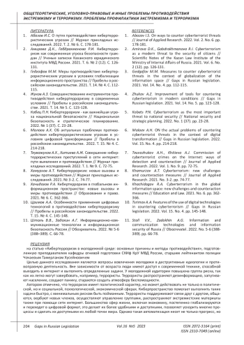 8. Хамурзов А.Т. Кибертерроризм: новые вызовы и меры противодействия // Журнал прикладных исследований. 2021. № 3-2. С. 74-77. EDN: ARTAJU