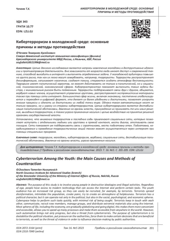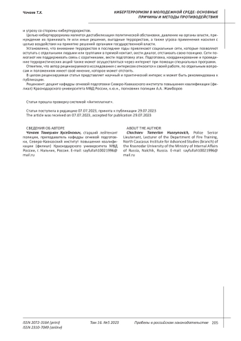 Teuvazhukov A.H., Khitieva A.J. Commission of cyberterrorist crimes on the Internet: ways of detection and counteraction // Journal of Applied Research. 2022. Vol. 1. No. 9. pp. 72-75.