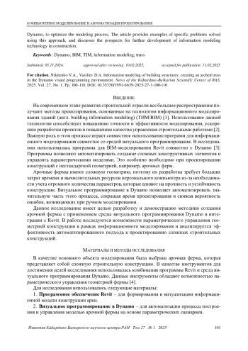 Статья посвящена применению возможностей информационного моделирования для создания сложных строительных конструкций на примере арочной фермы с использованием среды визуального программирования Dynamo. Авторы рассматривают преимущества использования этой технологии при проектировании строительных объектов и особенности работы с программой Revit, которая является основным инструментом для реализации представленного проекта. Использование автоматизации проектирования арочных ферм через написание скриптов в Dynamo позволяет значительно сократить временные затраты и повысить точность расчетов. Цель исследования: разработать метод для автоматизированного создания информационной модели арочной фермы в Revit с помощью Dynamo для оптимизации процесса моделирования. В статье приводятся примеры конкретных задач, решаемых с помощью данного подхода, и рассматриваются перспективы дальнейшего развития технологии информационного моделирования в строительстве.