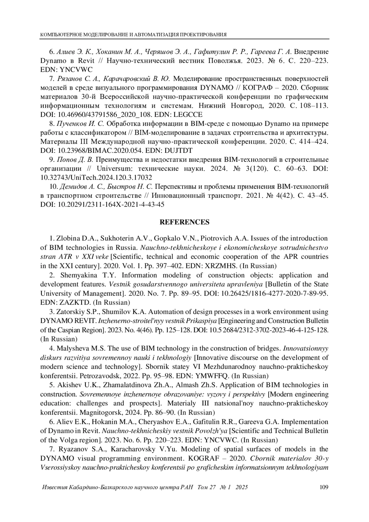 6. Алиев Э. К., Хоканин М. А., Черяшов Э. А., Гафитулин Р. Р., Гареева Г. А. Внедрение Dynamo в Revit // Научно-технический вестник Поволжья. 2023. № 6. С. 220-223. EDN: YNCVWC