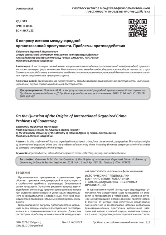ОСМАНОВ М. М. К ВОПРОСУ ИСТОКОВ МЕЖДУНАРОДНОЙ ОРГАНИЗОВАННОЙ ПРЕСТУПНОСТИ. ПРОБЛЕМЫ ПРОТИВОДЕЙСТВИЯ // ПРОБЕЛЫ В РОССИЙСКОМ ЗАКОНОДАТЕЛЬСТВЕ. 2023. Т. 16 № 5