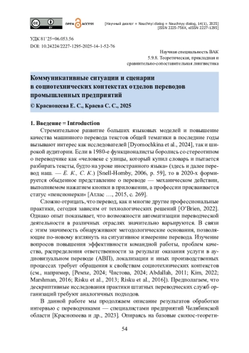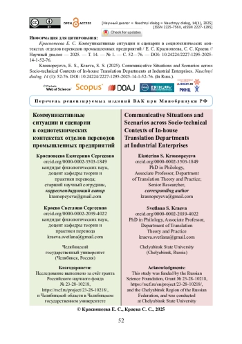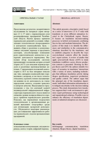 Представлены результаты дескриптивного исследования на материале серии интервью (11 ч 37 мин) с переводчиками семи разнопрофильных предприятий Челябинской области. Изучен процесс принятия переводческих решений в условиях гибридизации технологически опосредованного и контактного взаимодействия. Цель — выявить общее и различное в коммуникативных ситуациях перевода и предложить категории, способствующие пониманию роли социотехнических контекстов в экспертной деятельности переводчика. Выполнен обзор исследований, системно применяющих положения акторно-сетевой теории (АСТ) для описания перевода-продукта в различных производственных цепочках. С применением положений скопос-теории и АСТ на базе интервью описано два типа сценариев взаимодействия переводчиков с акторами, в том числе технологическими, в разной степени оказывающими влияние на их деятельность на этапах определения скопоса, создания транслята и контроля качества. Высказывается предположение о том, что ключевой задачей индивидуальной информационной инфраструктуры переводческого отдела является снижение уровня неопределённости в процессе принятия переводческого решения. Показано, как переводчики посредством технологических и организационных решений выполняют «подстройку» среды для оптимизации экспертной деятельности. Обсуждаются некоторые рекомендации для повышения эффективности работы переводческих отделов промышленных предприятий.