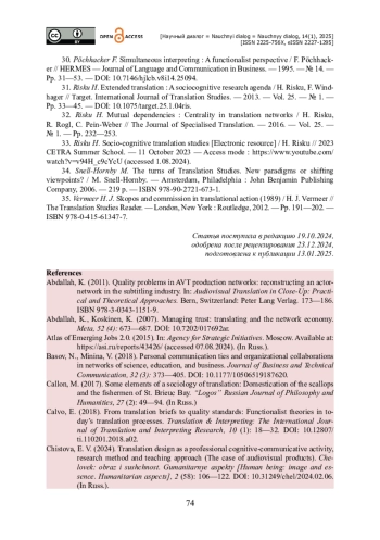 30. Pöchhacker F. Simultaneous interpreting : A functionalist perspective / F. Pöchhacker // HERMES - Journal of Language and Communication in Business. - 1995. - № 14. - Pp. 31-53. - https://doi.org/10.7146/hjlcb.v8i14.25094.