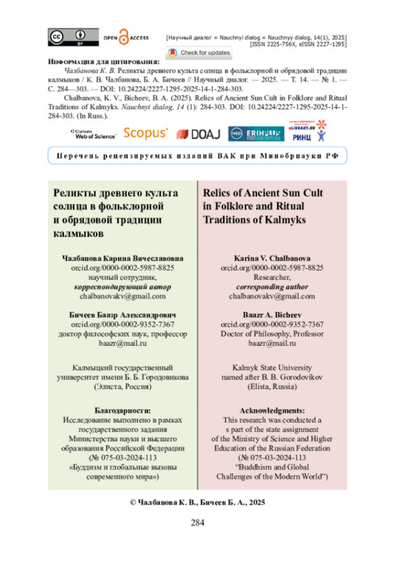ЧАЛБАНОВА К. В., БИЧЕЕВ Б. А. РЕЛИКТЫ ДРЕВНЕГО КУЛЬТА СОЛНЦА В ФОЛЬКЛОРНОЙ И ОБРЯДОВОЙ ТРАДИЦИИ КАЛМЫКОВ // НАУЧНЫЙ ДИАЛОГ. 2025. ТОМ 14, № 1