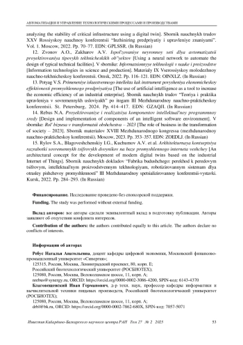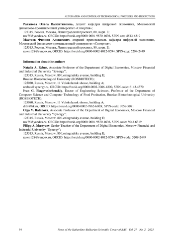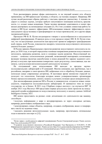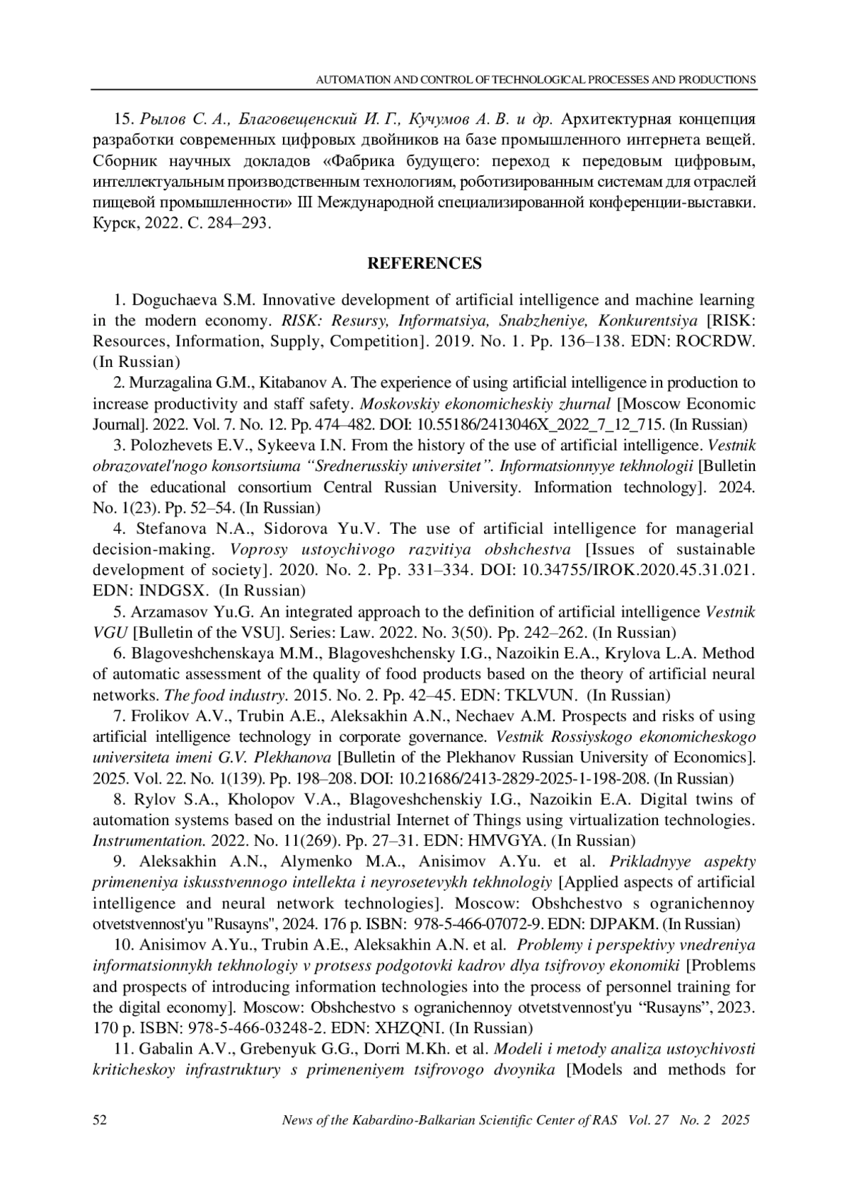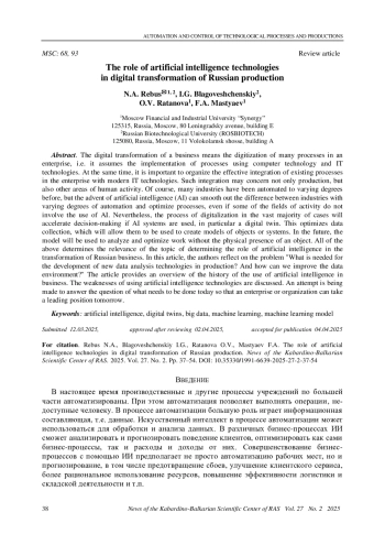 РЕБУС Н. А., БЛАГОВЕЩЕНСКИЙ И. Г., РАТАНОВА О. В., МАСТЯЕВ Ф. А. РОЛЬ ТЕХНОЛОГИЙ ИСКУССТВЕННОГО ИНТЕЛЛЕКТА В ЦИФРОВОЙ ТРАНСФОРМАЦИИ РОССИЙСКОГО ПРОИЗВОДСТВА // ИЗВЕСТИЯ КАБАРДИНО-БАЛКАРСКОГО НАУЧНОГО ЦЕНТРА РАН. 2025. ТОМ 27 № 2