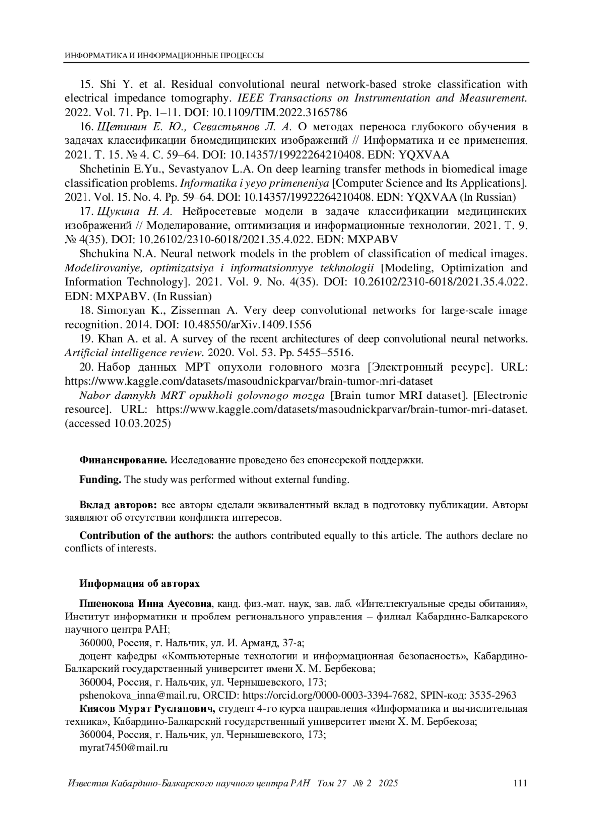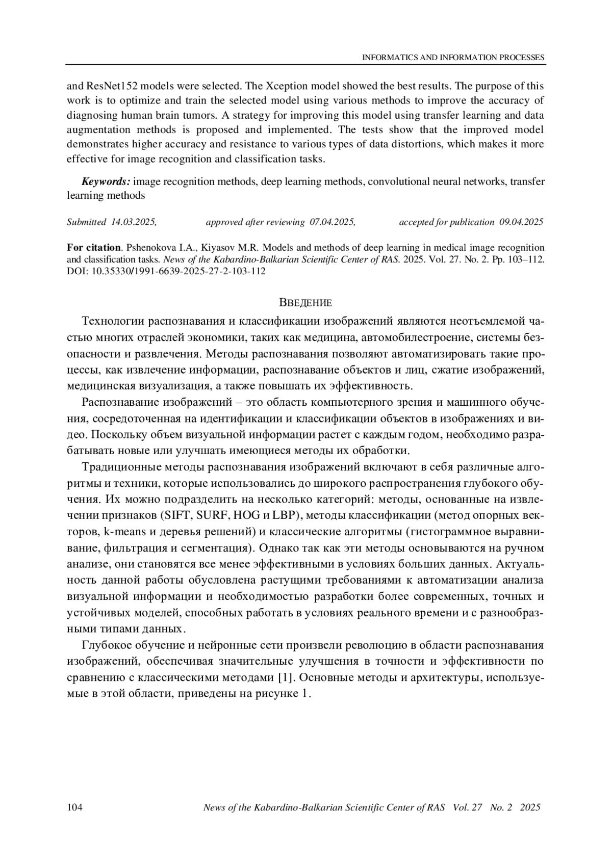 ПШЕНОКОВА И. А., КИЯСОВ М. Р. МОДЕЛИ И МЕТОДЫ ГЛУБОКОГО ОБУЧЕНИЯ В ЗАДАЧАХ РАСПОЗНАВАНИЯ И КЛАССИФИКАЦИИ МЕДИЦИНСКИХ ИЗОБРАЖЕНИЙ // ИЗВЕСТИЯ КАБАРДИНО-БАЛКАРСКОГО НАУЧНОГО ЦЕНТРА РАН. 2025. ТОМ 27 № 2