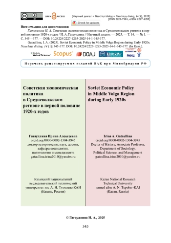 Рассматривается вопрос реализации нэпа в Татарской республике, Ульяновской, Самарской и Саратовской губерниях. Институциональные принципы организации внутреннего рынка, выработанные в рамках ленинского проекта, определяются как основание хозяйственной деятельности. Представлены результаты сравнительного анализа региональной сети. Установлено, что стремительный рост торговли происходил за счет динамики абсолютных показателей частного и укрепления позиций государственного и кооперативного секторов. Подчеркивается, что если в губернском товарообороте сдвиг произошел в сторону госорганов, то в Татреспублике фиксируется сбалансированное соотношение торговых конкурентов с преимуществом частного капитала. Обосновывается, что благодаря предшествующему опыту началось возрождение рыночной конъюнктуры, обусловившей эволюционную направленность проводимой политики. Показано, что регулирование отражало попытку взвешенного подхода властных структур к частной конкуренции, их стремление дать критическую оценку своим действиям по отношению к кооперации. Однако факты некомпетентности, упрощенных решений насущных задач позволяют утверждать, что узаконение произвольной власти государства насильственно вмешиваться в ход восстановительного процесса — дело времени. Автор приходит к выводу, что противовесом разрушительной силе классовой ненависти может быть только сила созидательного потенциала социального партнерства, выстраивающего экономику компромисса.