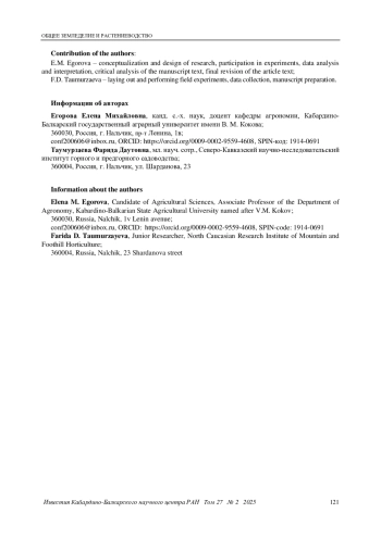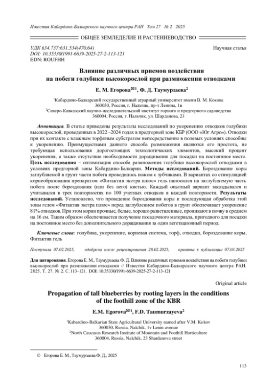 11. Егорова Е. М., Таумурзаева Ф. Д. Укоренение одревесневших черенков голубики высокорослой без применения туманообразующей системы // Известия Кабардино-Балкарского научного центра РАН. 2025. Т. 27. № 1. С. 11-19. DOI: 10.35330/1991-6639-2025-27-1-11-19 EDN: BYIEDX