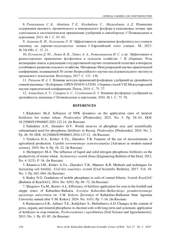 8. Рамазанова С. Б., Айтбаев Т. Е., Калдыбаев С., Малимбаева А. Д. Изменение содержания валового, органического и минерального фосфора в каштановых почвах при длительном и систематическом применении удобрений в севооборотах // Почвоведение и агрохимия. 2013. № 1. С. 83-85.