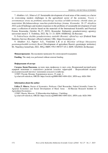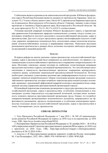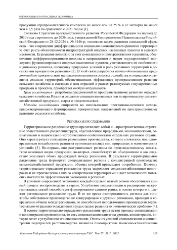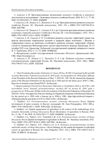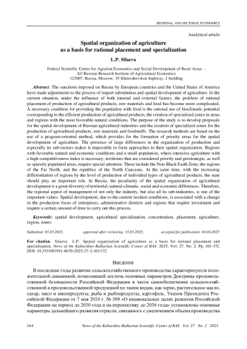 СИЛАЕВА Л. П. ПРОСТРАНСТВЕННАЯ ОРГАНИЗАЦИЯ СЕЛЬСКОГО ХОЗЯЙСТВА КАК ОСНОВА РАЦИОНАЛЬНОГО РАЗМЕЩЕНИЯ И СПЕЦИАЛИЗАЦИИ // ИЗВЕСТИЯ КАБАРДИНО-БАЛКАРСКОГО НАУЧНОГО ЦЕНТРА РАН. 2025. ТОМ 27 № 2
