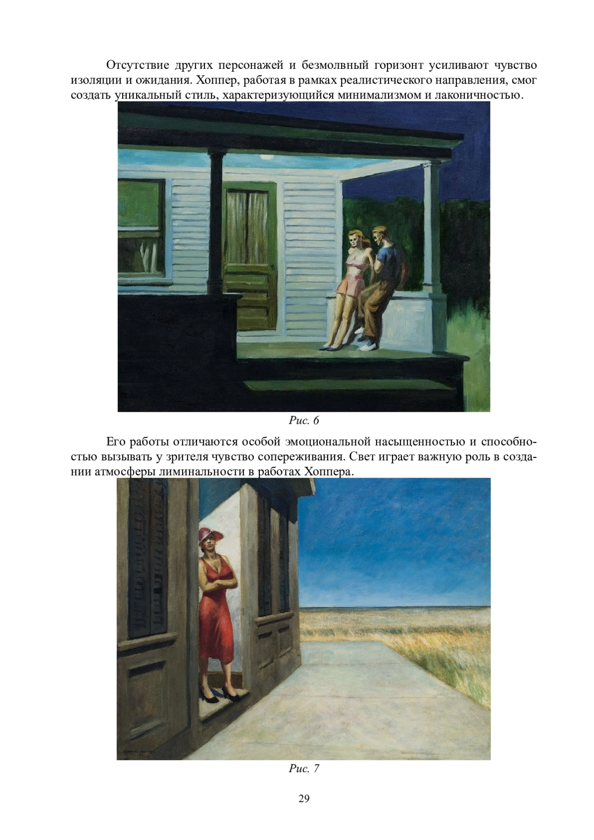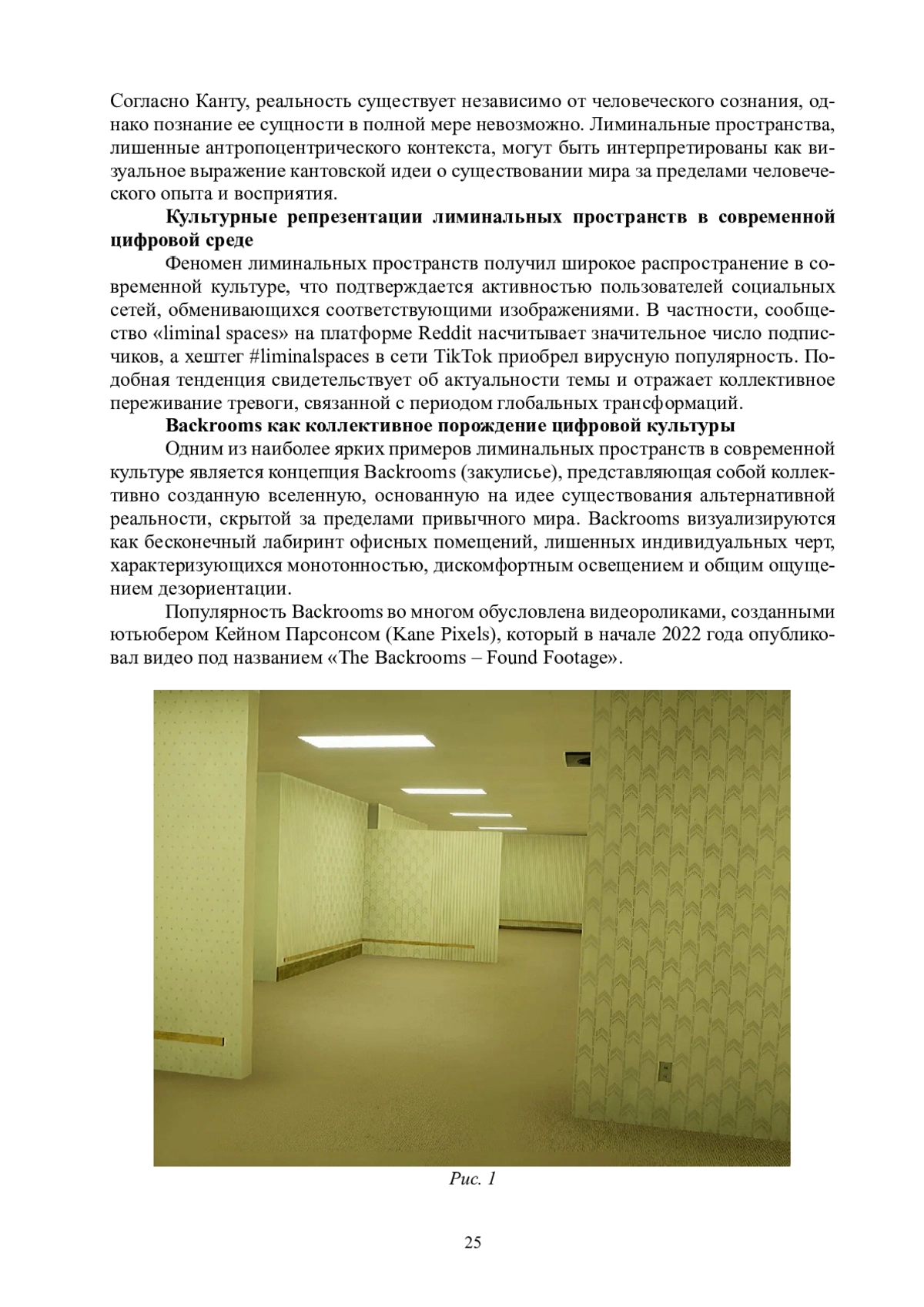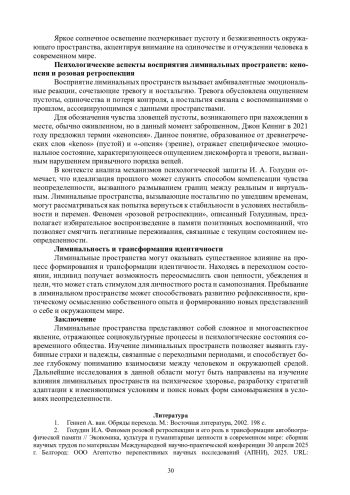 Статья исследует феномен лиминальных пространств как зон переходных состояний, вызывающих амбивалентные эмоции тревоги и меланхолии. Через междисциплинарный анализ (философия, культурология, психология) раскрывается их роль в современной культуре, включая примеры из искусства, цифровой среды (Backrooms) и психологических концепций (кенопсия, розовая ретроспекция). Работа подчеркивает связь лиминальности с трансформацией идентичности и отражением коллективных страхов в условиях глобальных перемен.