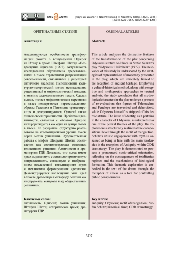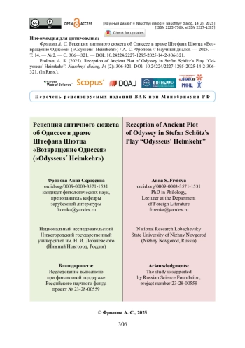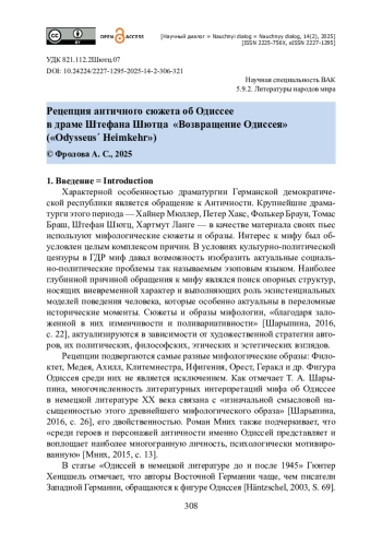 Анализируются особенности трансформации сюжета о возвращении Одиссея на Итаку в драме Штефана Шютца «Возвращение Одиссея» (1972). Актуальность исследования обусловлена представленными в пьесе стратегиями репрезентации современности, связанными с рецепцией античного наследия. Использованы культурно-исторический метод исследования, рецептивный и мифопоэтический подходы к анализу художественного текста. Сделан вывод, что все мифологические персонажи в пьесе подвергаются переосмыслению: образы Телемаха и Пенелопы травестируются и дегероизируются, Одиссей также лишен своей героичности. Проблема идентичности, связанная с образом Одиссея, интерпретируется как одна из центральных в пьесе. Её раскрытие структурно реализовано на композиционном уровне пьесы через мотив узнавания. Художественная работа с мифом Штефана Шютца оценивается как соответствующая основным тенденциям рецепции Античности в драматургии ГДР. Доказано, что пьеса имеет ярко выраженную социально-критическую направленность, связанную с изображением последствий тоталитарного строя и механизмов формирования идеологии. Демонстрируется воплощение этих идей в тексте драмы через метафору болезни как инструмента контроля над общественным сознанием.
