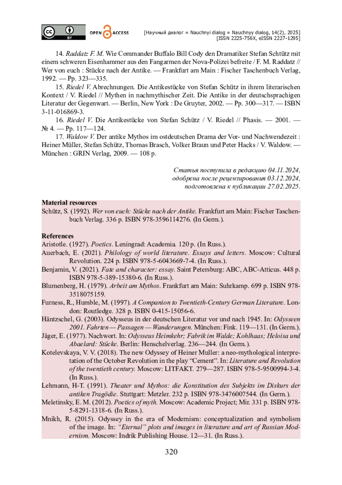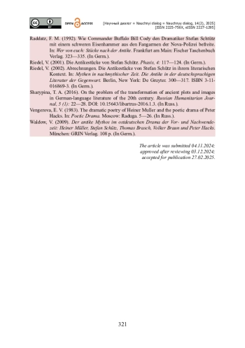 15. Riedel V. Abrechnungen. Die Antikestücke von Stefan Schütz in ihrem literarischen Kontext / V. Riedel // Mythen in nachmythischer Zeit. Die Antike in der deutschsprachigen Literatur der Gegenwart. - Berlin, New York : De Gruyter, 2002. - Pp. 300-317. - ISBN 3-11-016869-3.