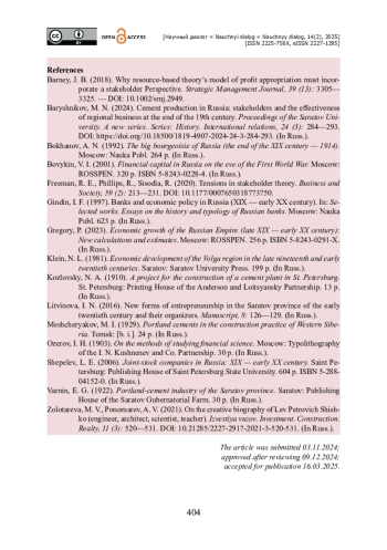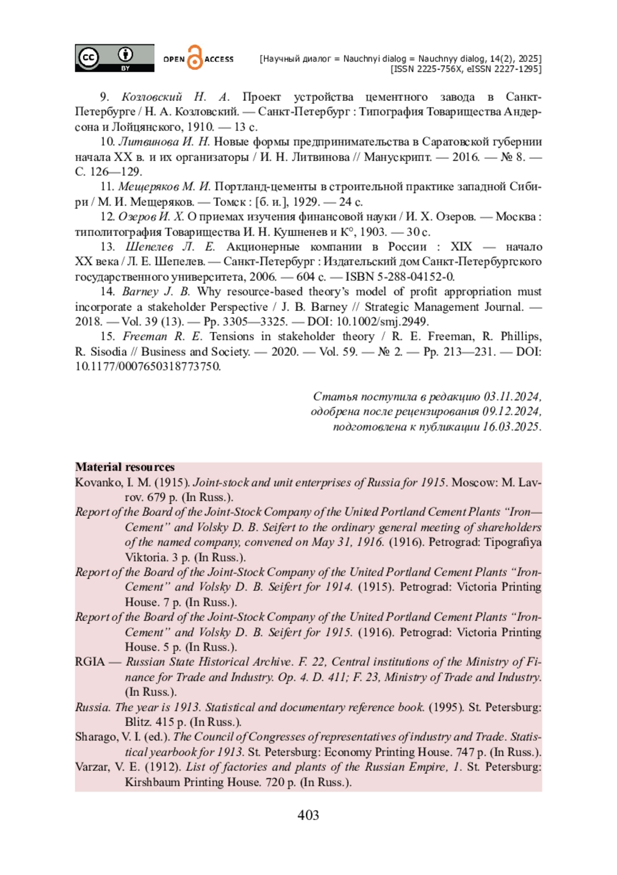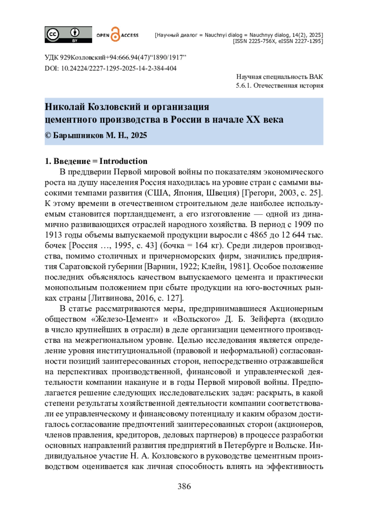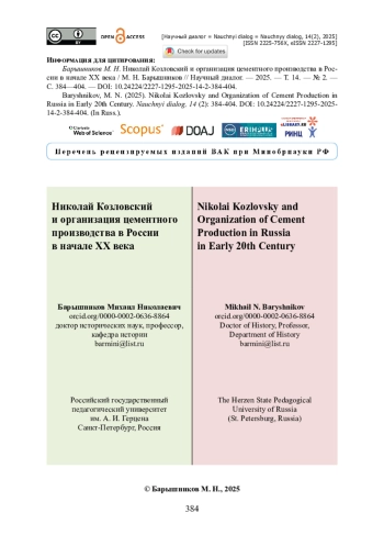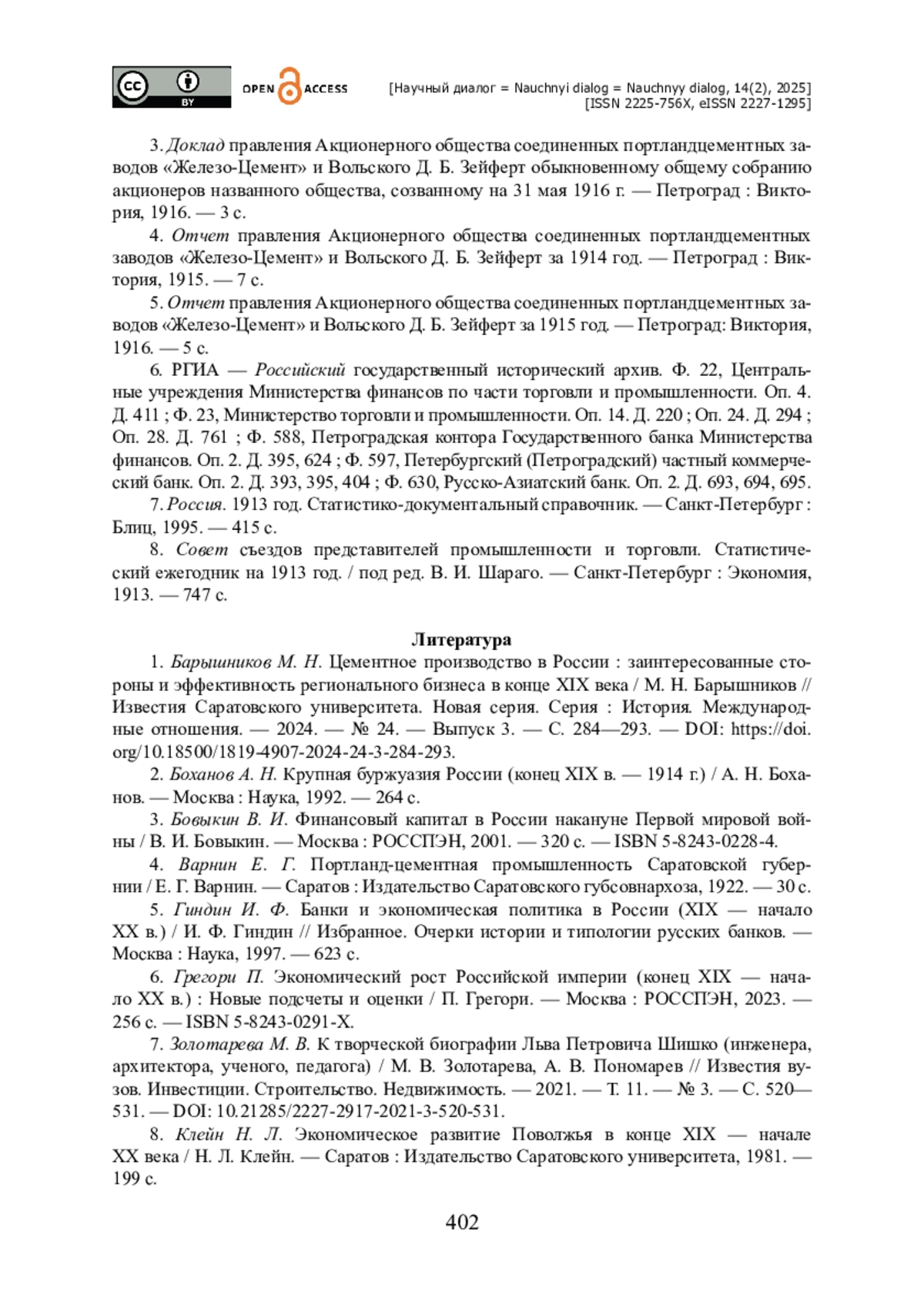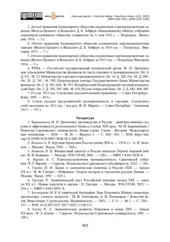 1. Барышников М. Н. Цементное производство в России : заинтересованные стороны и эффективность регионального бизнеса в конце XIX века / М. Н. Барышников // Известия Саратовского университета. Новая серия. Серия : История. Международные отношения. - 2024. - № 24. - Выпуск 3. - С. 284-293. - https://doi.org/10.18500/1819-4907-2024-24-3-284-293.