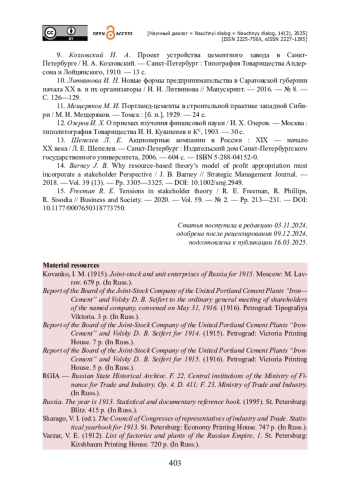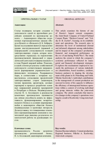 Статья посвящена истории создания и деятельности одной из крупнейших российских компаний по производству цемента — Акционерного общества соединенных портландцементных заводов «Железо-Цемент» и «Вольского Д. Б. Зейферта. Целью исследования является определение уровня институциональной (правовой и неформальной) согласованности позиций заинтересованных сторон, которая непосредственно отражалась на перспективах производственной, финансовой и управленческой деятельности фирмы накануне и в годы Первой мировой войны. Показано, в какой степени результаты хозяйственной деятельности соответствовали направленности формирования управленческого и финансового потенциала. Раскрываются меры, в соответствии с которыми осуществлялось согласование предпочтений заинтересованных сторон (акционеров, членов правления, кредиторов, деловых партнеров) в процессе разработки основных направлений развития предприятий в Петербурге и Вольске. Индивидуальное участие Н. А. Козловского в руководстве цементным производством оценивается как личная способность влиять на эффективность функционирования межрегионального бизнеса в условиях формировавшейся в акционерном обществе баланса индивидуальных и групповых интересов. Делается вывод, что новационные изменения в функционировании компании в значительной мере являлись результатом его многолетней работы на руководящих постах.