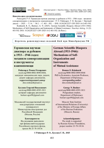 Разумеется, в немецкоязычной литературе таких работ больше, при том что издан целый ряд специализированных трудов [Doyum, 1985; Fischer, 1991; Stiefel, Mecklenburg, 1991; Schwartz, 1995; Longerich, 1998; Feichtinger, 2001; Grüttner et al., 2007; Benzenhöfer et al., 2017], посвященных непосредственно этой проблеме и деятельности Чрезвычайной ассоциации немецких ученых за рубежом (далее — Ассоциации).