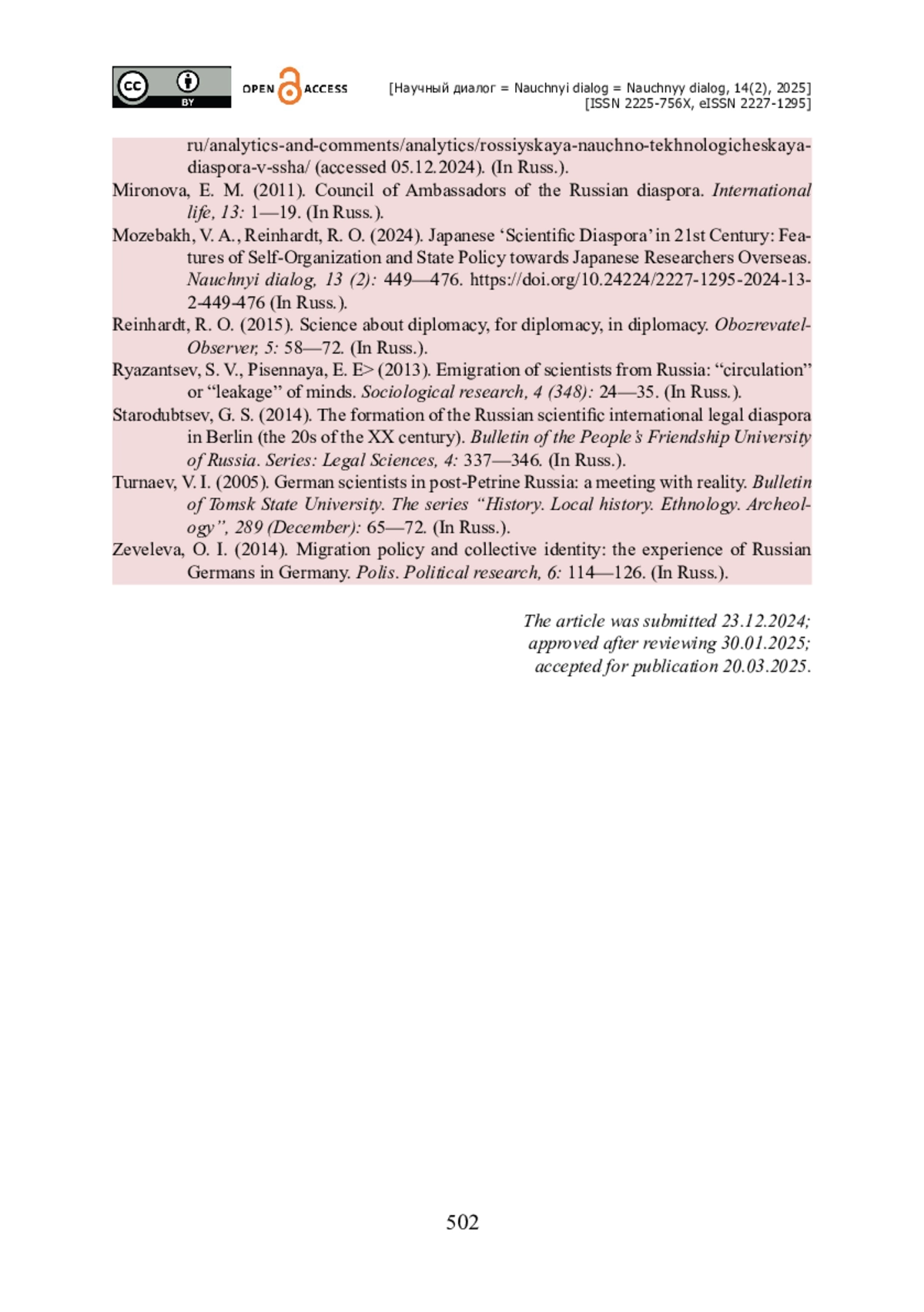 11. Мозебах В. А. Японская «научная диаспора» в XXI веке : особенности самоорганизации и политика государства в отношении работающих за рубежом ученых / В. А. Мозебах, Р. О. Райнхардт // Научный диалог. - 2024. - № 2. - С. 449- 476. - https://doi.org/10.24224/2227-1295-2024-13-2-449-476.