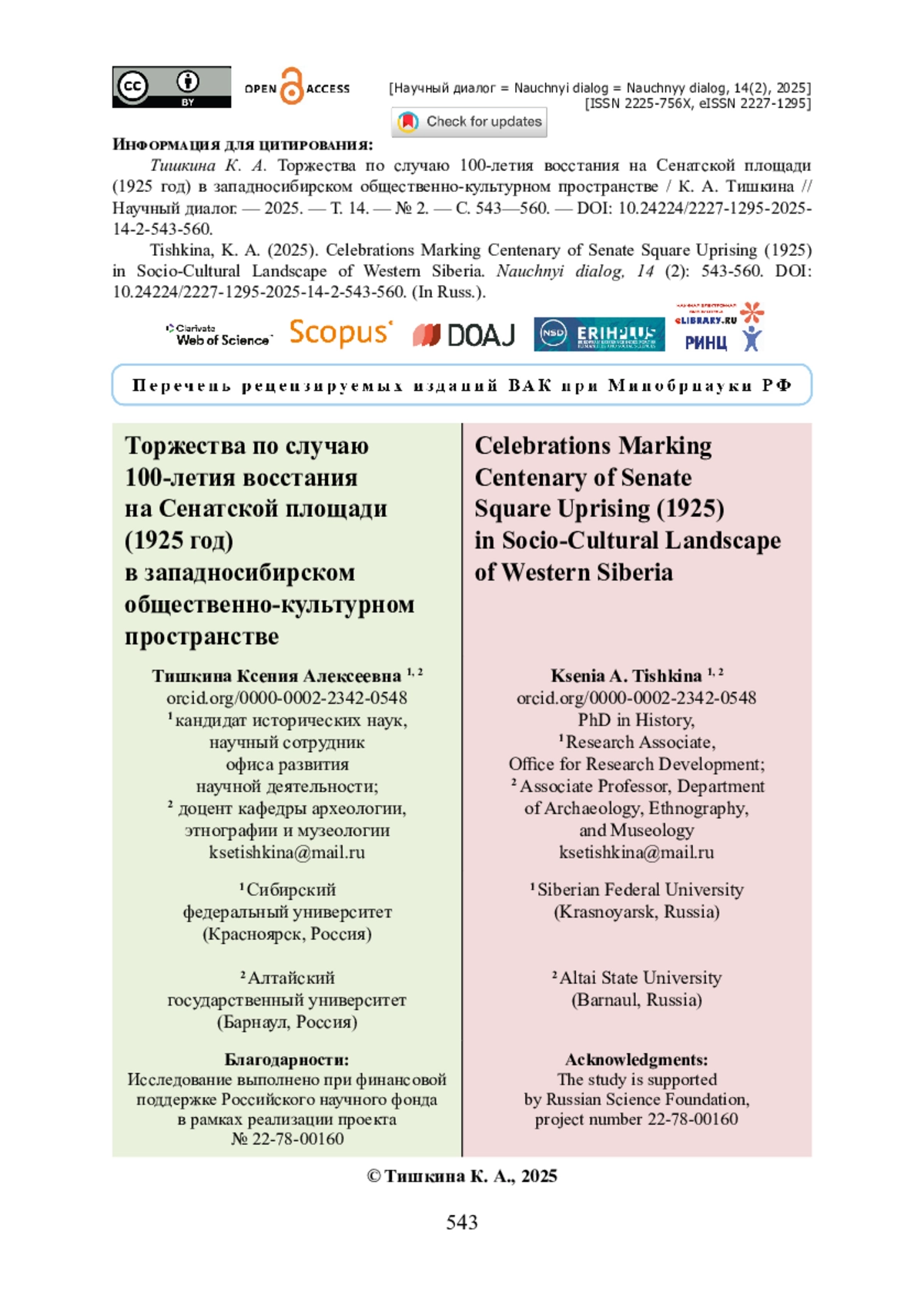 2. Бахтурин В. В. Столетний юбилей восстания декабристов в социокультурном контексте 20-х годов XX века : варианты конструирования исторической памяти / В. В. Бахтурин // Ученые записки Казанского университета. Серия : Гуманитарные науки. - 2021. - Т. 163. - № 6. - С. 71-85. - https://doi.org/10.26907/2541-7738.2021.6.71-85.