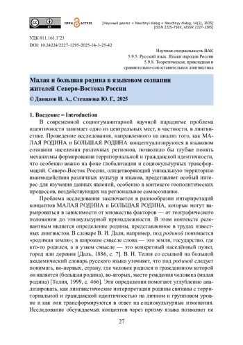 В статье представлены результаты психолингвистического исследования концептов МАЛАЯ РОДИНА и БОЛЬШАЯ РОДИНА в языковом сознании жителей Северо-Востока России на примере Якутии и Чукотки. С помощью метода субъективной дефиниции, реализованного в рамках массового социологического опроса (N=1434), были выявлены ключевые смысловые доминанты и коннотации, связанные с данными понятиями. Анализ полученных ассоциаций позволил выделить основные категории, отражающие различные уровни территориальной идентичности респондентов — от глобального до локального. Особое внимание уделено региональной специфике языкового сознания, а также возрастным и гендерным различиям в интерпретации изучаемых концептов. Результаты исследования демонстрируют сложную многоуровневую структуру понятий «малая родина» и «большая родина», которые выступают как маркеры локальной, региональной и гражданской идентичности в сознании жителей Северо-Востока России. Полученные данные вносят вклад в развитие психолингвистического подхода к изучению территориальной идентичности и открывают перспективы для дальнейших междисциплинарных исследований в данной области.