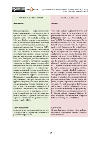 Проанализированы эвфемизированные слова и выражения на тему миграционного кризиса в статьях немецких электронных изданий «Taz», «Süddeutsche Zeitung» за 2024 год. Выбор данного периода объясняется повышенным вниманием немецкой прессы к событиям, которые связаны с миграционным кризисом в Германии и США. Актуальность исследования обусловлена тем, что проблемы в области миграции способствуют появлению новых политкорректных эвфемизмов и выражений. На основе таких критериев, как обозначение негативного денотата, улучшение характера денотата и др., была выявлена новая эвфемизированная лексика. Методом сплошной выборки было выделено 15 эвфемизированных номинаций. Авторы подробно комментируют каждый пример с позиций способов достижения эффекта эвфемизации. Предлагается классификация эвфемизмов миграционного дискурса по тематическим группам: мигранты, беженцы, депортация, депортированные. Авторы приходят к выводу о том, что немецкие авторы статей прибегают к таким способам эвфемизации, как словосложение и перифраза. Отмечается, что проблема миграции в статьях немецких авторов о Германии наиболее подвержена эвфемизации по сравнению с текстами статей о США.