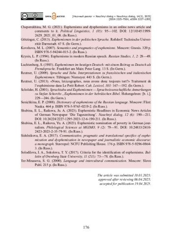 11. Шубина Э. Л. Эвфемистическая номинация бедности в публицистике Германии / Э. Л. Шубина, Ю. А. Райкова // Филологические науки в МГИМО. - 2023. - Т. 9. - № 2. - С. 79-91. - https://doi.org/10.24833/2410-2423-2023-2-35-79-91.