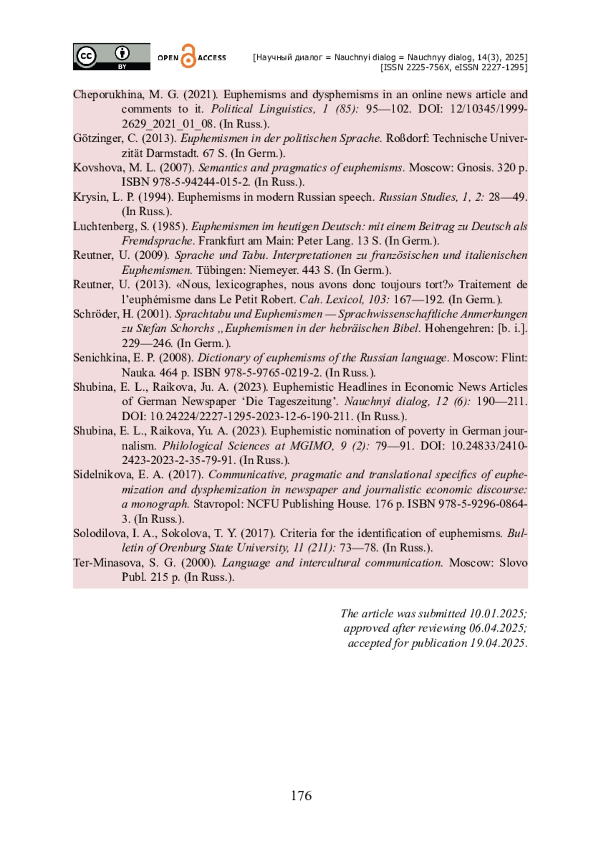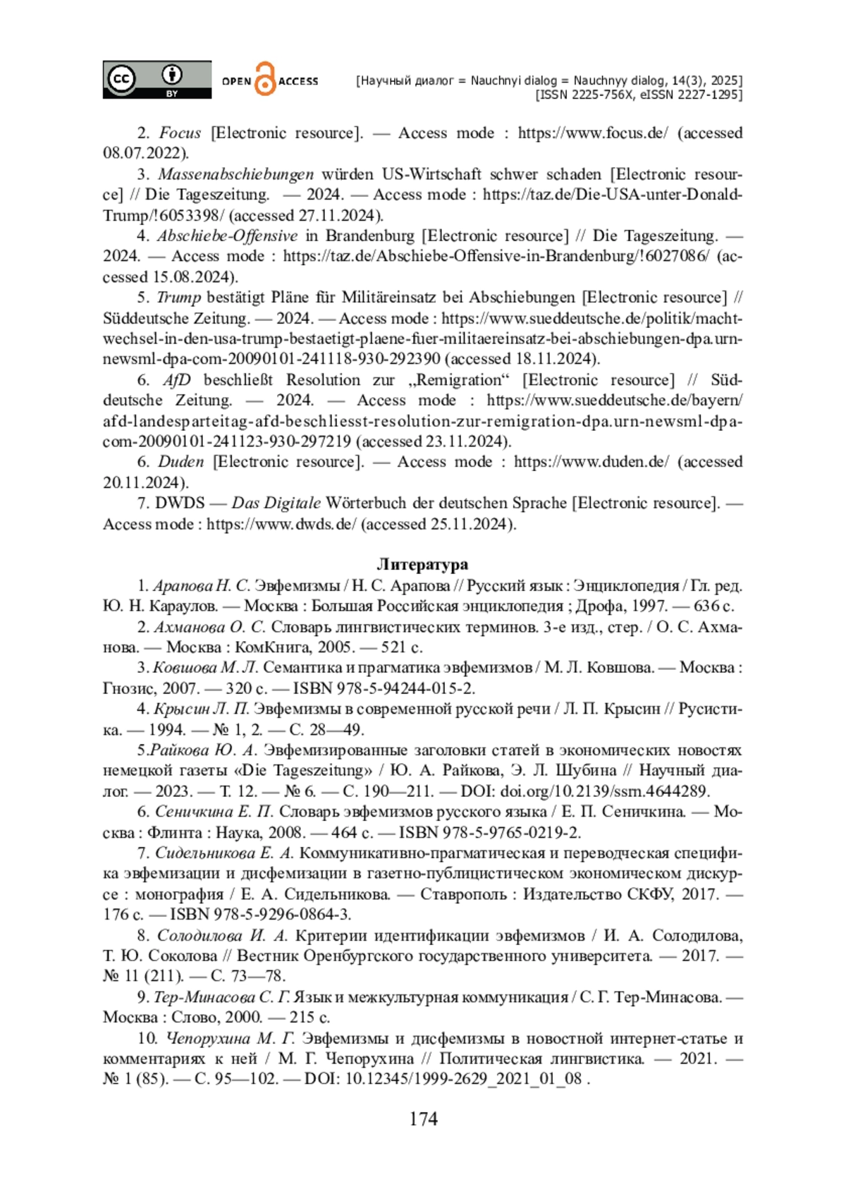 5. Райкова Ю. А. Эвфемизированные заголовки статей в экономических новостях немецкой газеты «Die Tageszeitung» / Ю. А. Райкова, Э. Л. Шубина // Научный диалог. - 2023. - Т. 12. - № 6. - С. 190-211. - https://doi.org/doi.org/10.2139/ssrn.4644289.