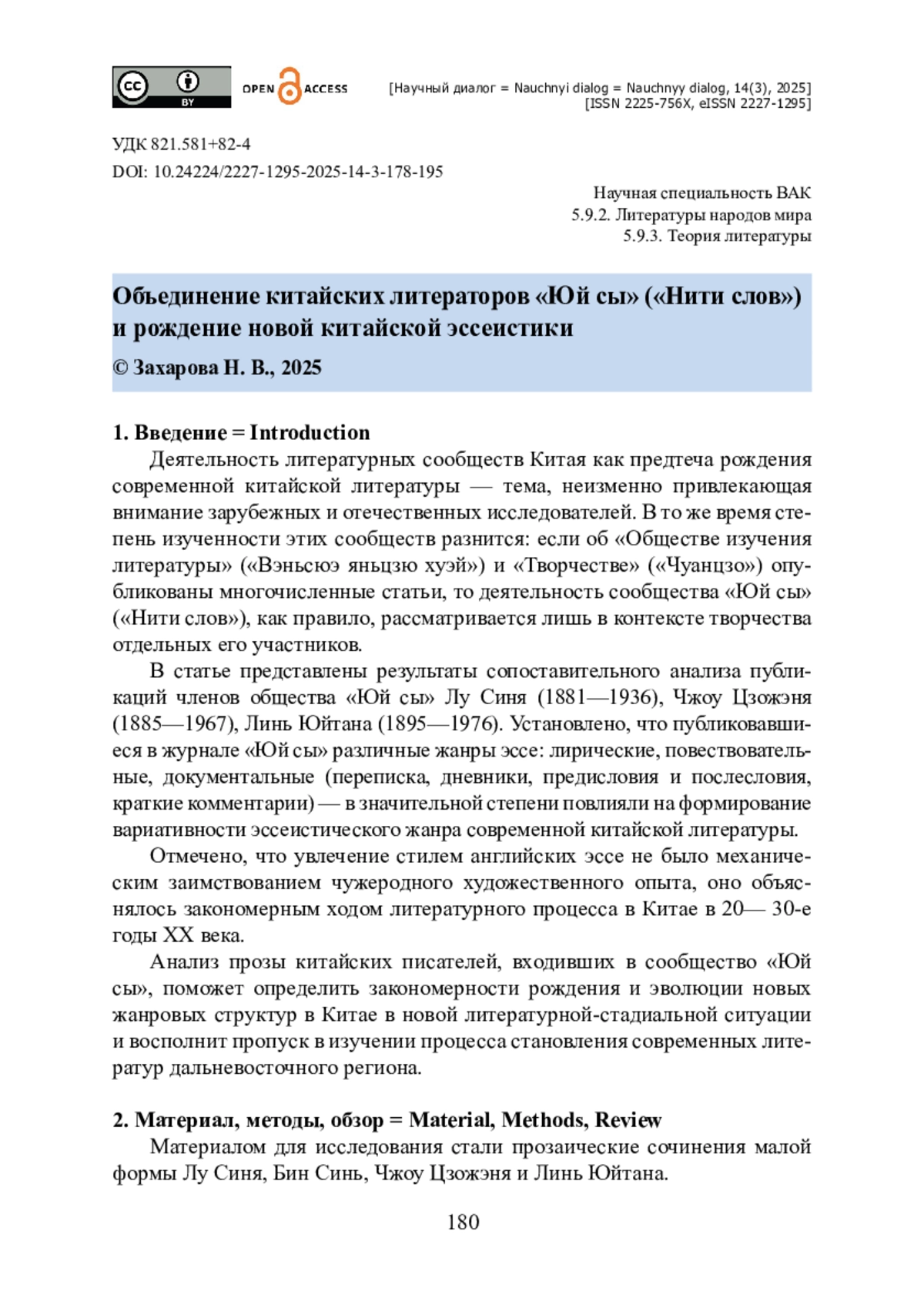 Рассматривается деятельность китайских писателей и критиков, в 20—30-е годы ХХ века входивших в объединение «Юй сы» («Нити слов») и издававших сначала в Пекине, а затем в Шанхае одноименный еженедельник. Актуальность исследования обусловлена необходимостью восполнения лакун в сфере изучения литературного процесса в Китае в указанный период. Новизна исследования обусловлена тем, что в статье представлены результаты анализа статей, опубликованных в журнале «Юй сы» Лу Синем, Бин Синь, Чжоу Цзожэнем, Линь Юйтанем, чья эссеистика оказала значительное влияние на формирование современной китайской литературы. Отмечается, что увлечение китайских писателей жанрами саньвэнь (эссе), саньвэнь сяошо (очерки), саньвэнь ши (стихи в прозе) происходило благодаря рецепции произведений английской и русской литературы. Охарактеризована практика позиционирования и философии журнала, издаваемого литературным обществом «Юй сы»: Чжоу Цзожэнь декларировал принципы свободы и случайности в содержании и форме публикуемых произведений. Доказано, что жанр эссе европейских писателей в значительной степени обусловил эволюцию традиционных китайских жанров малой формы. В статье сделан вывод, что роль общества «Юй сы» на становление жанра эссе в китайской литературе недостаточно изучена российскими синологами и имеет перспективы дальнейшего исследования.