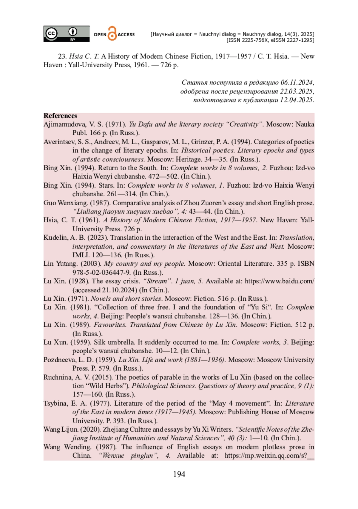 18. Ся Янь. О принципах общества «Юй сы» : структура единомышленников и жанровое смещение (1924-1927) [Электронный ресурс] / Ся Янь // Научный журнал современной литературы. - 2021. - № 10. - Режим доступа : https://www.chinawriter.com.cn (дата обращения 21.10.2024) (夏寅. 想象《语丝》的方式:同人结构与文体偏移(1924-1927. 现代文学学报. - 2021. - № 10).