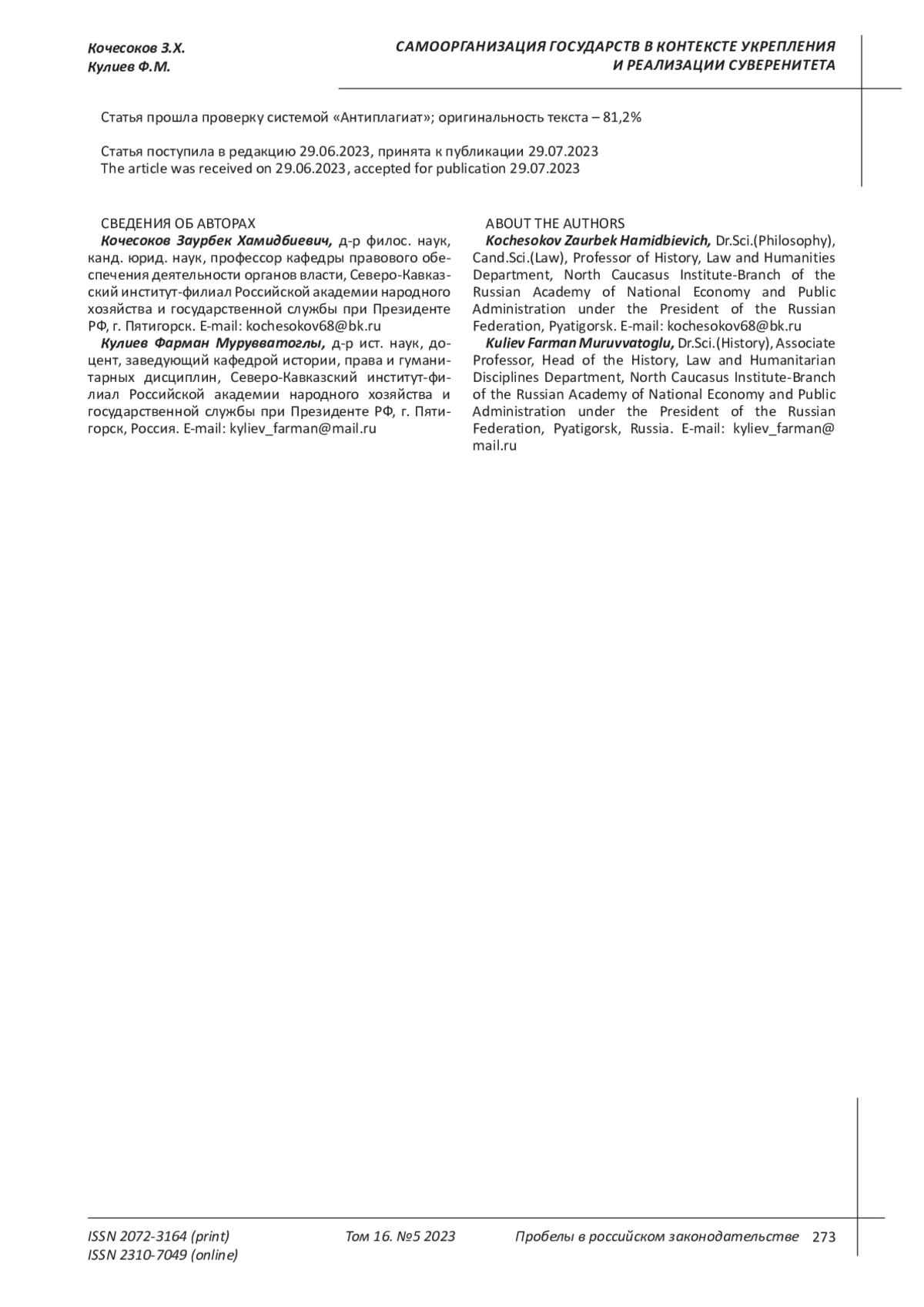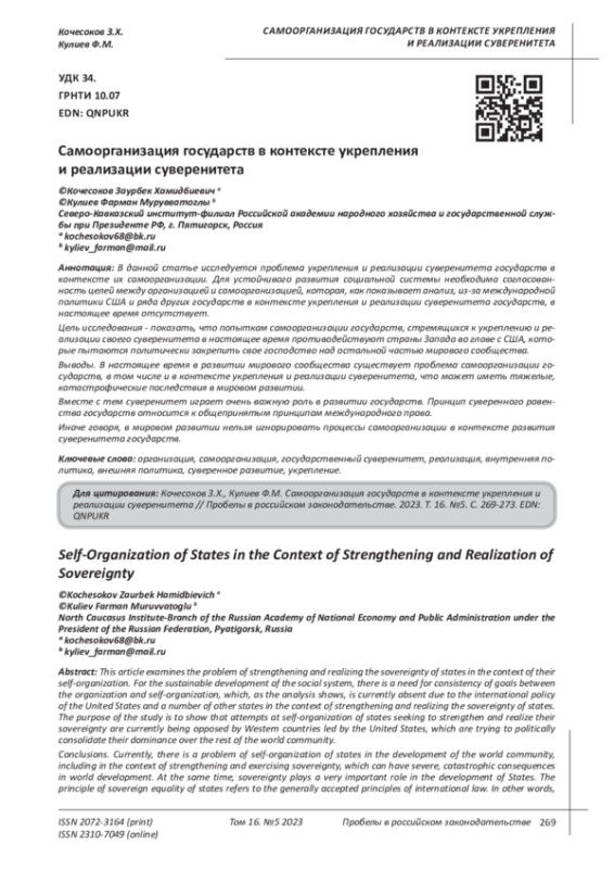 В данной статье исследуется проблема укрепления и реализации суверенитета государств в контексте их самоорганизации. Для устойчивого развития социальной системы необходима согласованность целей между организацией и самоорганизацией, которая, как показывает анализ, из-за международной политики США и ряда других государств в контексте укрепления и реализации суверенитета государств, в настоящее время отсутствует. Цель исследования - показать, что попыткам самоорганизации государств, стремящихся к укреплению и реализации своего суверенитета в настоящее время противодействуют страны Запада во главе с США, которые пытаются политически закрепить свое господство над остальной частью мирового сообщества. Выводы. В настоящее время в развитии мирового сообщества существует проблема самоорганизации государств, в том числе и в контексте укрепления и реализации суверенитета, что может иметь тяжелые, катастрофические последствия в мировом развитии. Вместе с тем суверенитет играет очень важную роль в развитии государств. Принцип суверенного равенства государств относится к общепринятым принципам международного права. Иначе говоря, в мировом развитии нельзя игнорировать процессы самоорганизации в контексте развития суверенитета государств.