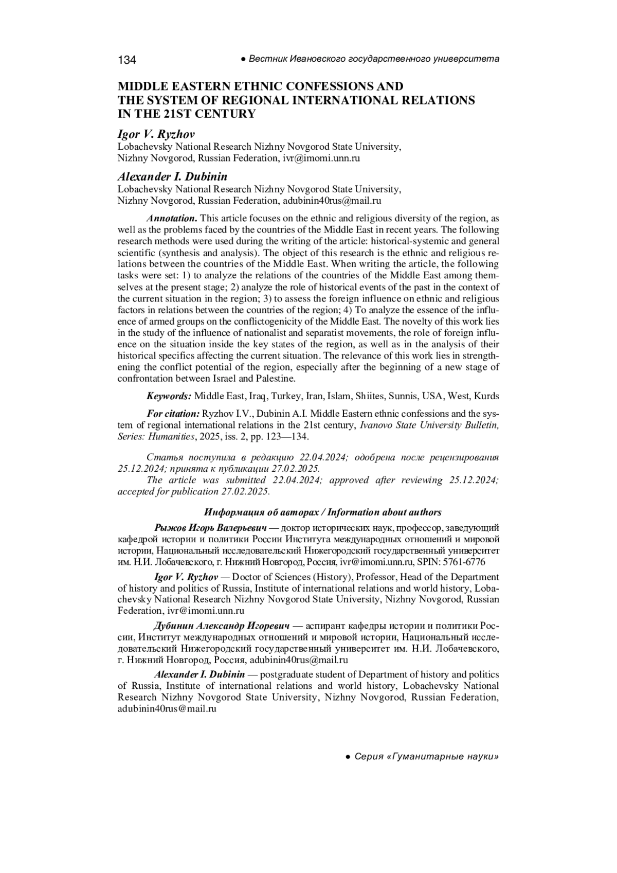 Ryzhov I.V. Borodina M.Yu., Savicheva E.M. The Middle East: the search for a new security architecture in a changing world, Bulletin of St. Petersburg University. Oriental and African Studies, 2023, no.15, pp. 418-435. - In Russ.