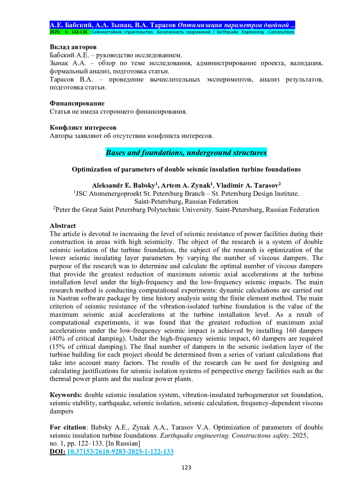 3. Tarasov V.A. Double Seismic Insulation System of Turbine Unit Foundation // Сonstruction of unique buildings and structures. 2020, vol. 91, p. 9101.