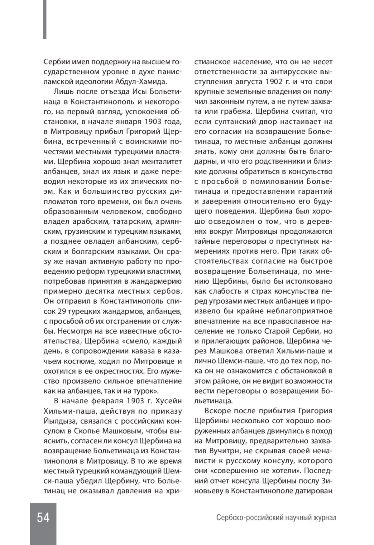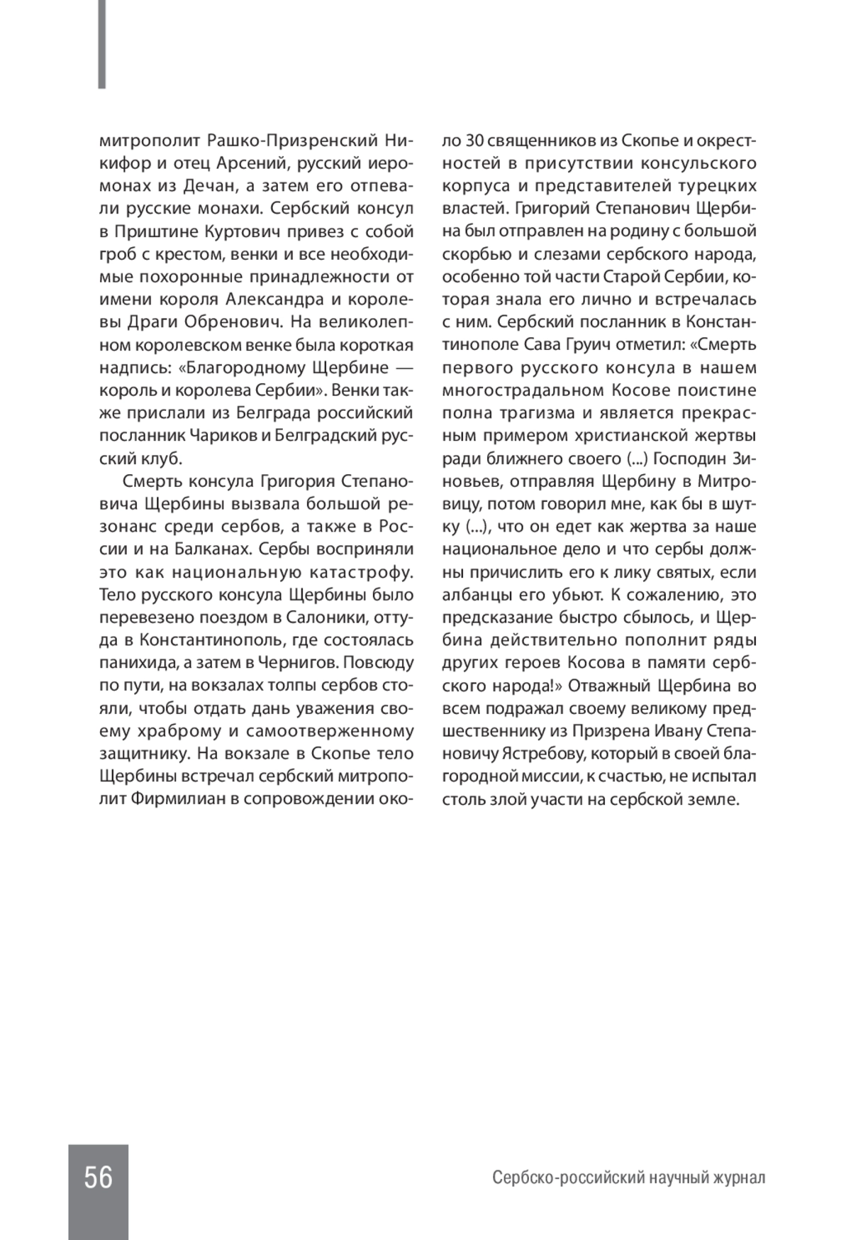Статья повествует о трагической судьбе русского консула Григория Степановича Щербины, который служил в Митровице (ныне часть Косова) во время политической нестабильности и насилия в начале XX века. Щербина, пришедший на должность в 1902 г., стал жертвой заговора албанцев, что подчеркивает продолжающуюся историческую драму сербского народа в Старой Сербии и его стремление к стабильности и защите своих интересов. Автор рассматривает не только биографию Щербины, но и контекст его службы, который включает в себя сложные международные отношения, вмешательство иностранных держав и описание внутреннего конфликта на Балканах.