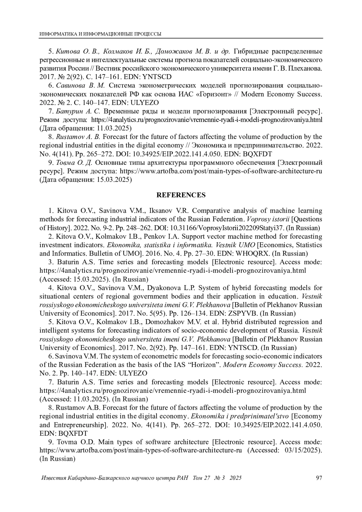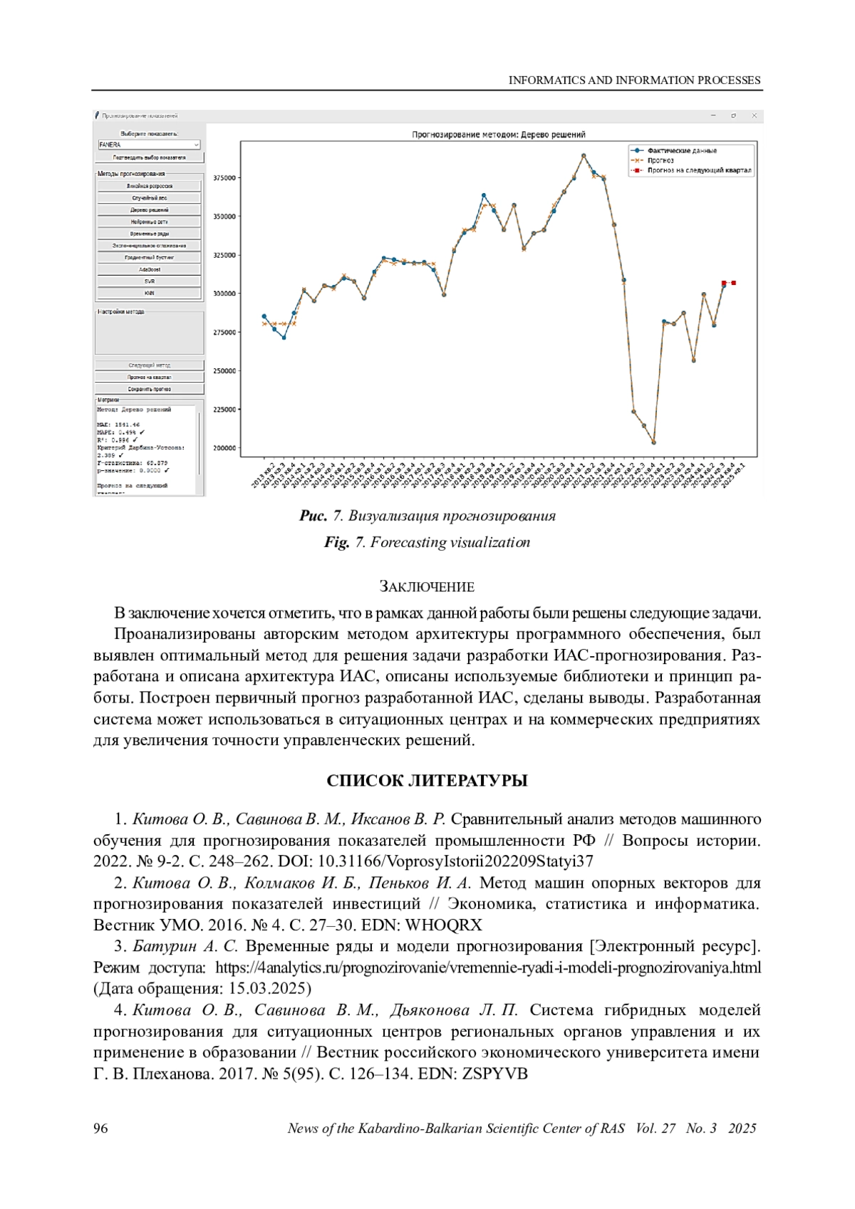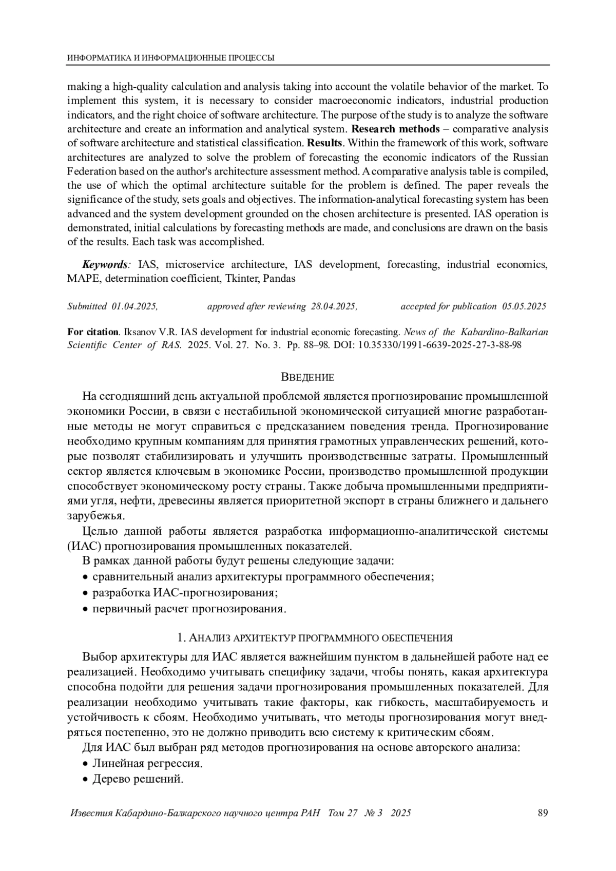 ИКСАНОВ В. Р. РАЗРАБОТКА ИАС ДЛЯ РЕШЕНИЯ ЗАДАЧИ ПРОГНОЗИРОВАНИЯ ПРОМЫШЛЕННОЙ ЭКОНОМИКИ // ИЗВЕСТИЯ КАБАРДИНО-БАЛКАРСКОГО НАУЧНОГО ЦЕНТРА РАН. 2025. ТОМ 27 № 3