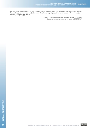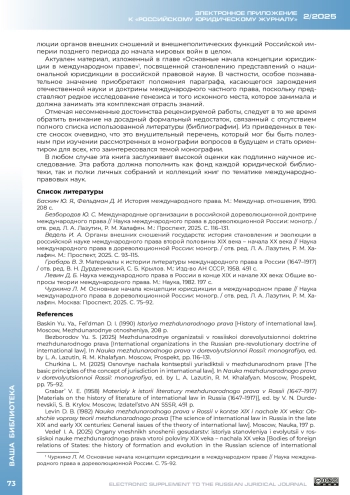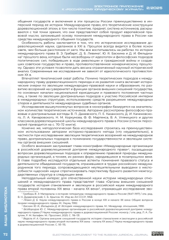 2. Безбородов Ю. С. Международные организации в российской дореволюционной доктрине международного права // Наука международного права в дореволюционной России: моногр. / отв. ред. Л. А. Лазутин, Р. М. Халафян. М.: Проспект, 2025. С. 116-131.