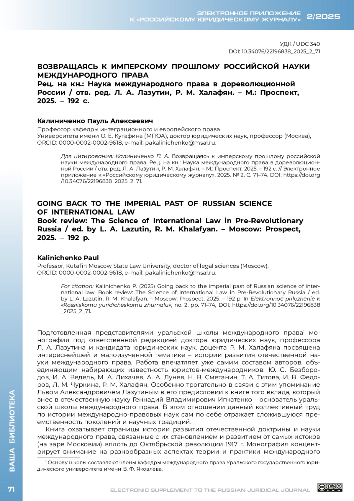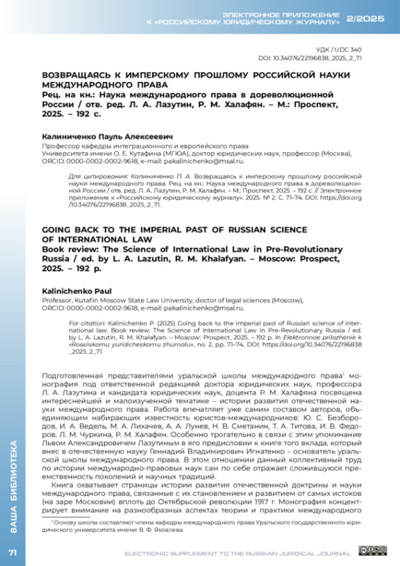 Подготовленная представителями уральской школы международного права монография под ответственной редакцией доктора юридических наук, профессора Л. А. Лазутина и кандидата юридических наук, доцента Р. М. Халафяна посвящена интереснейшей и малоизученной тематике – истории развития отечественной науки международного права. Работа впечатляет уже самим составом авторов, объединяющим набирающих известность юристов-международников: Ю. С. Безбородов, И. А. Ведель, М. А. Лихачев, А. А. Лунев, Н. В. Сметанин, Т. А. Титова, И. В. Федоров, Л. М. Чуркина, Р. М. Халафян. Особенно трогательно в связи с этим упоминание Львом Александровичем Лазутиным в его предисловии к книге того вклада, который внес в отечественную науку Геннадий Владимирович Игнатенко – основатель уральской школы международного права. В этом отношении данный коллективный труд по истории международно-правовых наук сам по себе отражает сложившуюся преемственность поколений и научных традиций.