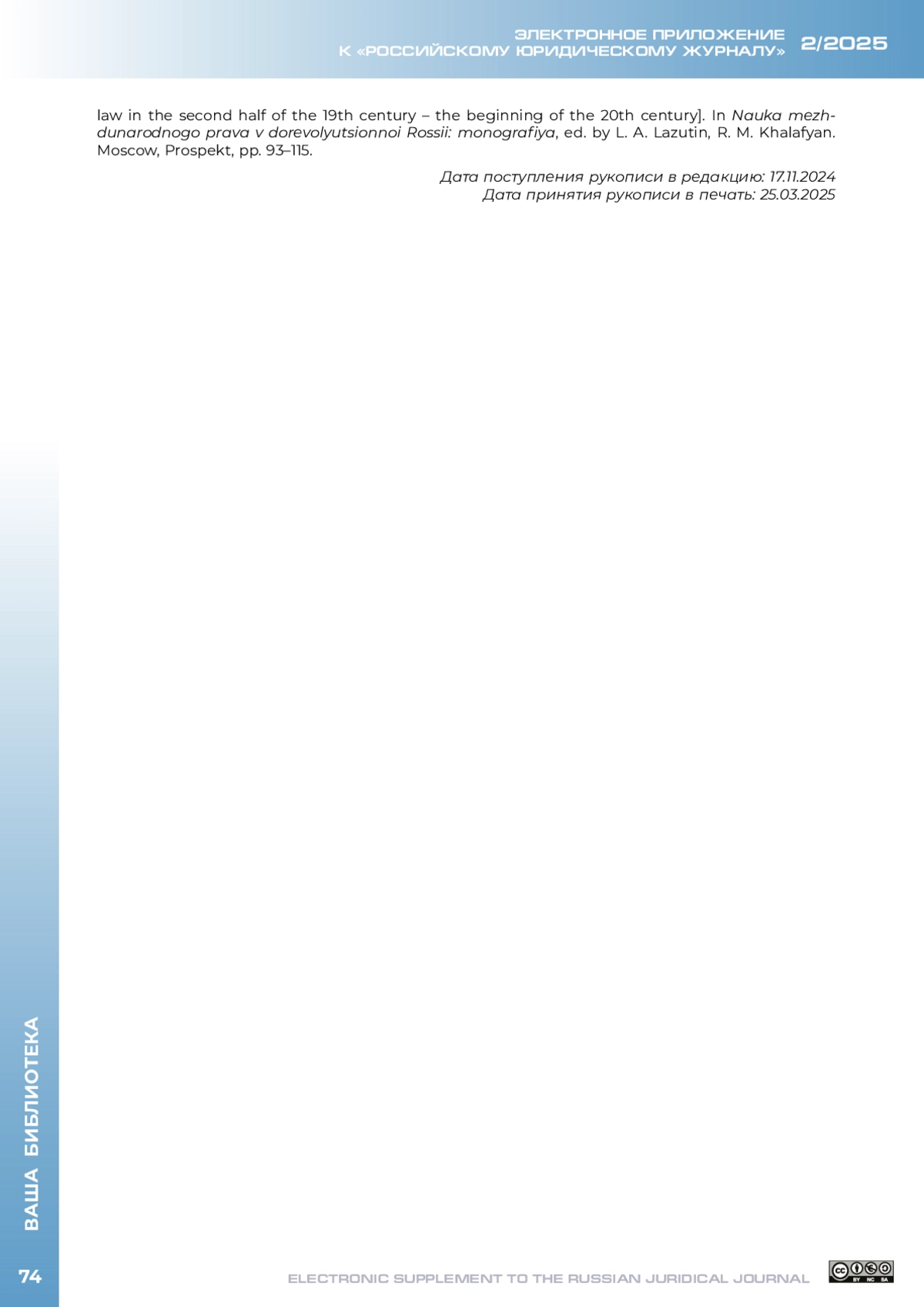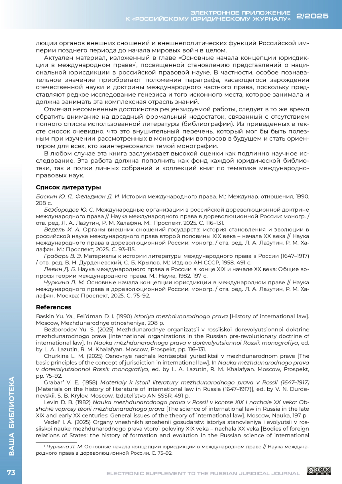 6. Чуркина Л. М. Основные начала концепции юрисдикции в международном праве // Наука международного права в дореволюционной России: моногр. / отв. ред. Л. А. Лазутин, Р. М. Халафян. Москва: Проспект, 2025. С. 75-92.