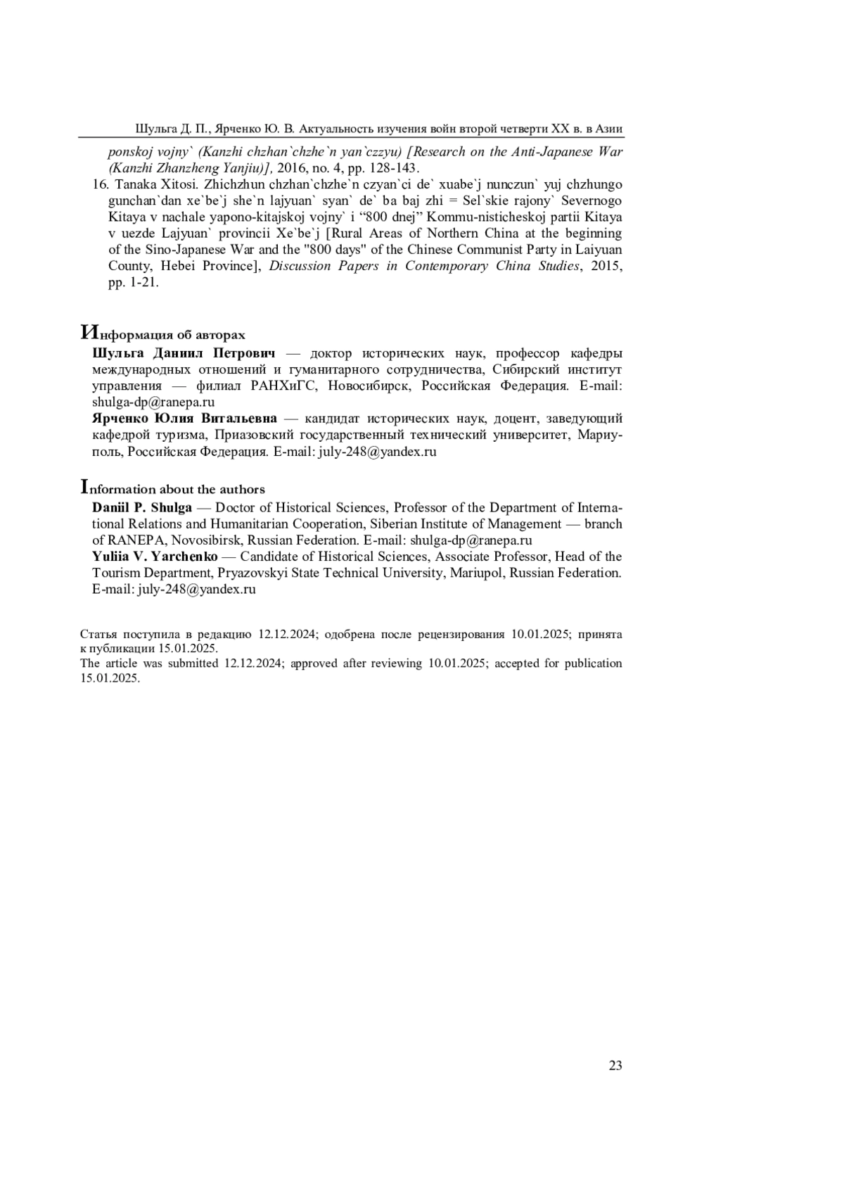ШУЛЬГА Д. П., ЯРЧЕНКО Ю. В. АКТУАЛЬНОСТЬ ИЗУЧЕНИЯ ВОЙН ВТОРОЙ ЧЕТВЕРТИ XX В. В АЗИИ // СИБИРЬ ГУМАНИТАРНАЯ. 2025. № 2 (10)